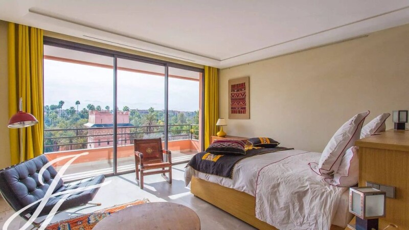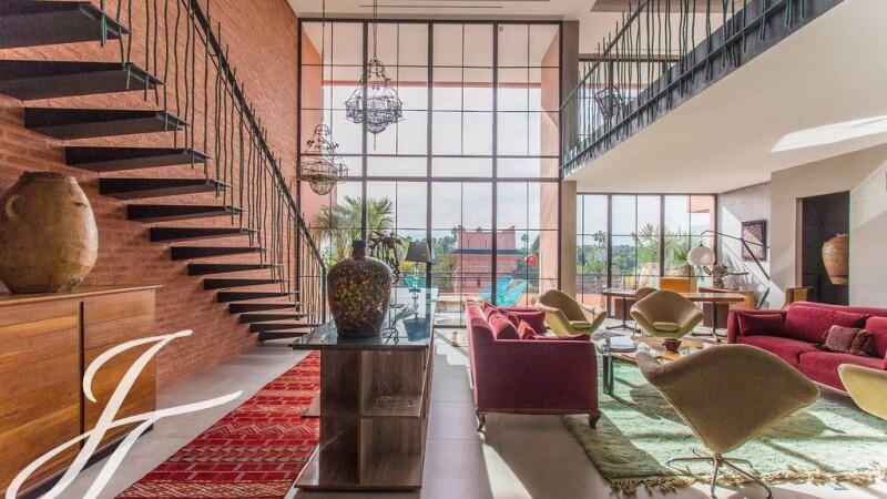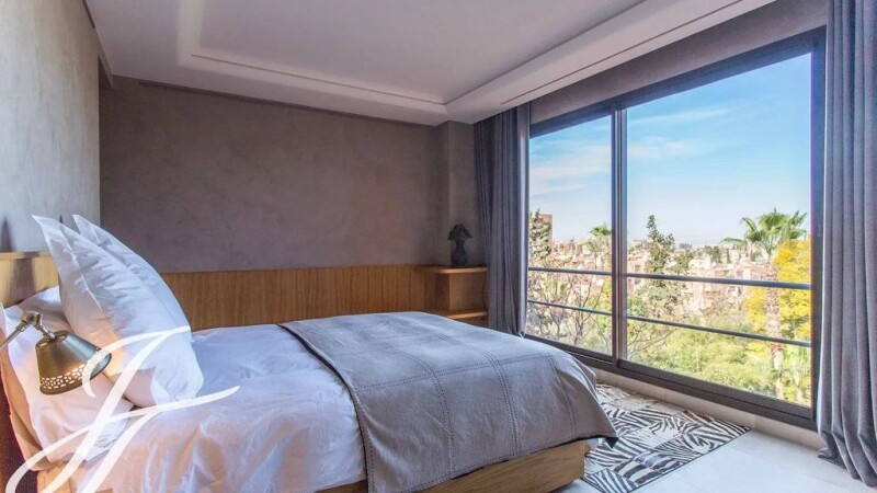 This property is utterly unique on the Marrakech market : it is located right opposite the iconic Majorelle Garden from Yves Saint-Laurent. On the 4th and 5th floors of an upscale building with private access from the elevator on each floor, the apartment offers from most rooms awesome views over Majorelle and the Atlas mountains. Besides, finishings and fittings are way above usual standards, such as heated floors. Boasting a 350 sqm internal size with an additional 50 smq terracing, it comprises over 2 levels : a living-room with fireplace, a dining-area on a mezzanine, an upscale fitted kitchen with food elevator, 3 bedrooms one of which a master with dressing, 2 bathrooms, a laundry and a maid room with shower. This exceptional titled property is being sold furnished and comes with a private parking and a cellar.