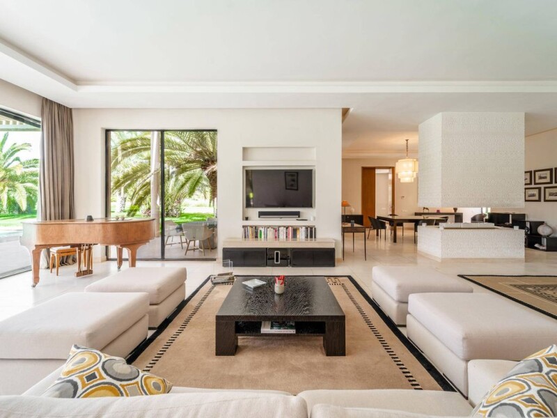 On the road to Ourika, only 15 minutes from Marrakech, this villa of 1.700 m² built on a wooded park of 2 hectares with a breathtaking view of the Atlas Mountains and without any onlookers. Palm groves border the entrance of the property. The first floor consists of a master bedroom equipped with an office, a dressing room, a bathroom, and a large terrace overlooking the property park. The building has a large living/dining area with a fireplace overlooking large floor-to-ceiling windows offering an unobstructed view of the garden and pool. There are also on the ground floor four bedrooms with a bathroom, dressing room and terrace, and a large equipped kitchen enjoying a panoramic view of the garden. On the poolside, a lovely pool house equipped with a summer kitchen, a bar, a living room, and a large dining room. It is the ideal place to share moments with friends in the middle of a lush garden. The property has a spa, hammam, massage room, and jacuzzi. In the middle of the garden is a billiard room with a bar. Others: 2 closed garages, air conditioning, central underfloor heating, service rooms, etc. The Ourika road extends Avenue Mohamed 6 to the top of Atlas mountain. For more information, please contact David Montérin at +212 6 71 43 72 27.