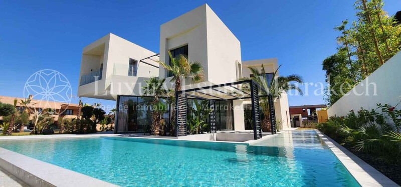 Golf Amelkis, 1st line, villa 700 m2, 6 bedrooms, 6 bathrooms, hammam, spa, elevator, jacuzzi, swimming pool, on 2200 m2. This modern style villa benefits from a rare finish and quality decoration. The volumes are spacious, the rooms are bright thanks to the numerous openings onto the hanging gardens. The villa is sold furnished, fully equipped. Basement: - 2 bedrooms with bathrooms overlooking an English courtyard - 1 staff bedroom - 1 Hammam - 1 massage room - 1 games room - 1 technical room Ground floor: - 1 dining room - 1 fireplace lounge - 1 TV lounge - 1 library lounge - 1 double kitchen - 1 guest toilet 1st floor: - 4 bedrooms with bathrooms and terraces with views and a jacuzzi Garden; 1100 m2 + 1100m2 for use - 1 swimming pool with water passageway and pergola Equipment: - 1 elevator - double glazing in all rooms High rental value Call 00 212 661 157 152.