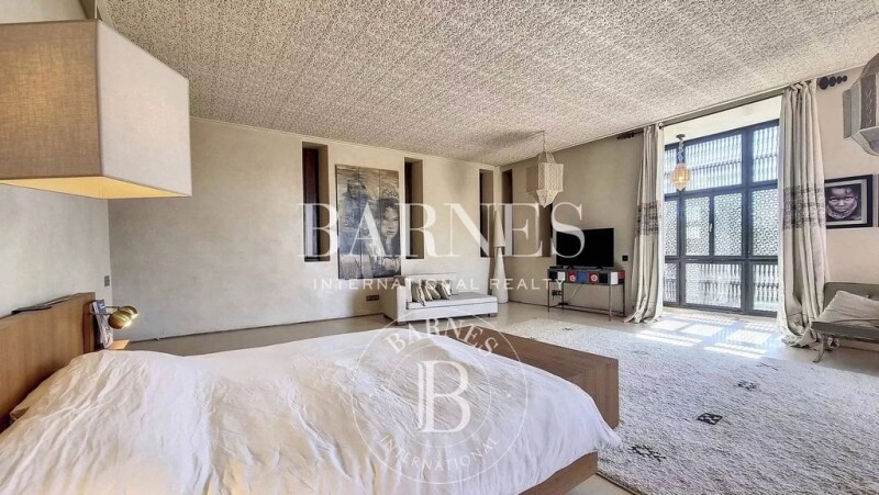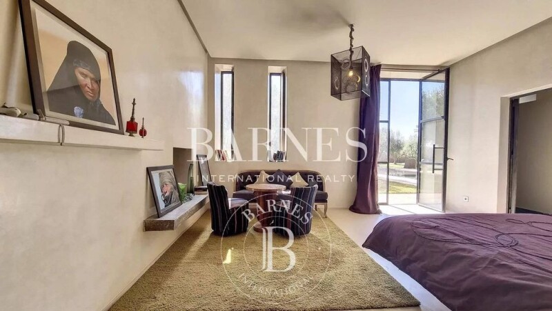 Beautiful villa of contemporary style that combines chic and warm spirit of the beautiful family houses and Moroccan architectural traditions. It is located in the Palmeraie of Marrakech close to the Relais & Chateaux Ksar Char Bagh. It offers six large rooms and a suite , a beautiful outdoor infinity pool , a spa with a massage area , a mixed hammam ( beldi and steam) and a heated indoor swimming pool, a screening room TV- Film , an integrated pool area in the living room. The biases architectural meet three principles: - Will global integration in its environment, walls built from earth of Marrakech which gives it its color, are adobe, the color of the pool gives it a look of river (wadi). Under its 'beldi' villa hides comfort and discreet luxury of its facilities: quality sanitary and electrical installations (imported) and choice of building materials. - Compact design for large habitat friendliness, the villa is spread around a patio surrounded by a corridor that distributes all the living spaces: kitchen, video room, billiards room built residence and Spa, which are sound systems. This design ensures the usability of the villa, without renouncing the peace and privacy that everyone can find in isolation: the spa, patio, roof terrace, the terraces of the upstairs bedrooms ... - Promote energy conservation and water walls pisés (best building insulation), the color of the outdoor pool which extends its heat, water heated on the roof that feeds a ball of the boiler (a economy mode for heating the indoor pool), but also the rainwater recovery system (for watering the garden) and filtration of wastewater (3 basins buried settling). The air conditioning system (hot / cold) powered by a heat pump air / air. This design ensures comfort whatever the time of year (at the height of the heat of summer as the cooler winter) and the number of guests. benefits: The villa is fully air conditioned. Garden level: A patio with a central basin, which ensures freshness. Dine even in summer. Large living room with fireplace, dining room and pool area overlooking the terrace and pool. screening room with theater screen / TV. covered terrace with fireplace. Spa with a heated pool, steam room and massage table, which opens onto the patio. 4 rooms with private bathrooms, dressing areas, each with direct access to the garden. Upstairs : 2 double bedrooms with bathroom and dressing room each with a private terrace. 1 large bedroom with bathroom, an office, dressing room and fireplace and a large panoramic terrace. gardens: Large pool with children's pool area and pergola, Sun Terrace. Puting golf, vegetable garden with mist, aromatic garden. Living dependency (for service) and several storage dependencies. Basement: 1 workroom. 1 large empty room open on English court (Possible fitness room or playroom). 1 technical room (boiler) 1 large fully equipped 10m hallway closet. 1 large laundry room with many cupboards. 1 cold room large capacity. 1 service apartment with 2 rooms open on English court, lounge, shower room and WC.