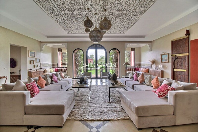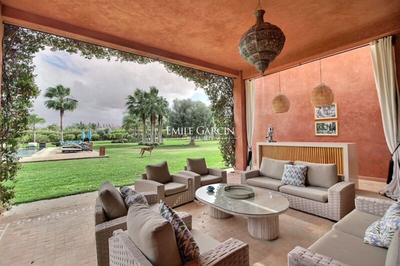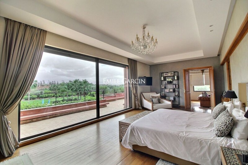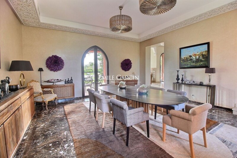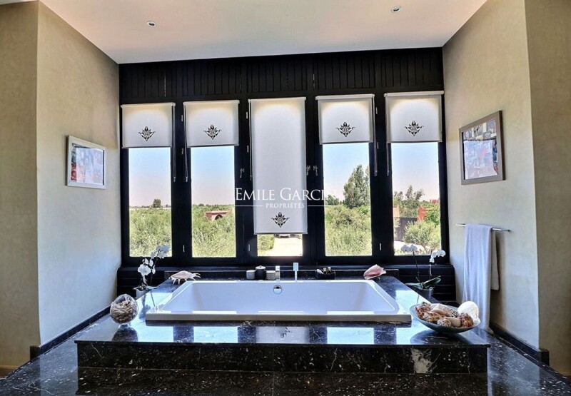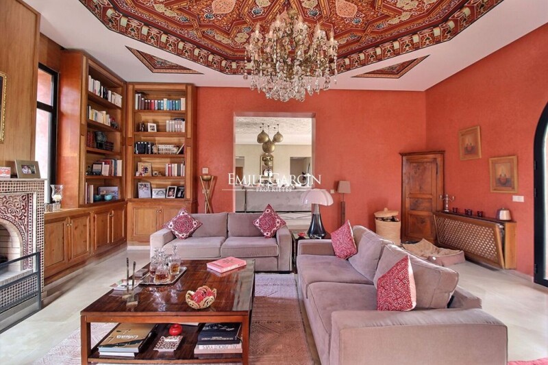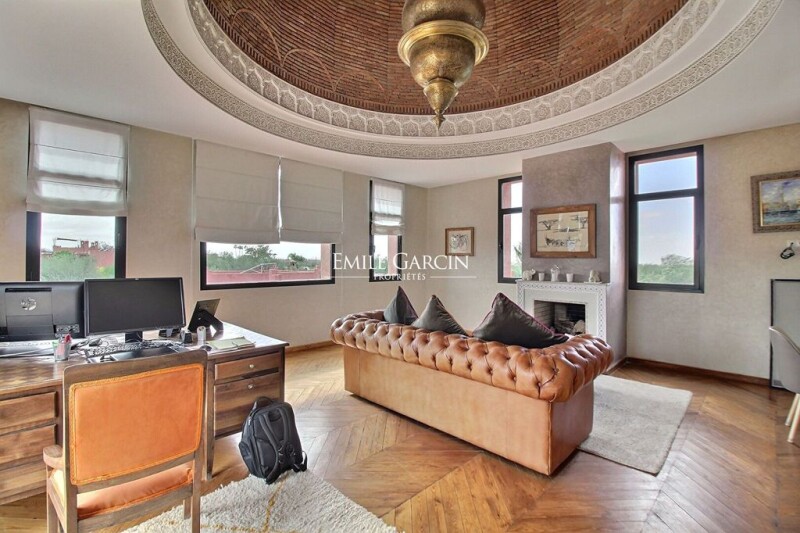 Beautiful property offering 900 m² of living area on one hectare of landscaped gardens. The ground floor comprises a vast main living area (110 m²), two Moroccan-style lounges, a dining room with marble flooring, a fireplace area, a fully equipped kitchen with a utility room and a cellar, and four suites. On the first floor, you will find a 160 m² master suite consisting of a dressing room, a bathroom and a library with its own fireplace. Several furnished outdoor spaces, swimming pool, petanque area, gym, hammam. The private grounds feature a magnificent rose garden, olive, palm and fruit trees. Service accommodation. Breathtaking views on the Atlas mountain.