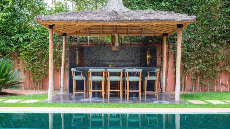 Exceptional Villa-Riad, in an exceptional site, located in the heart of Al Maaden, adjacent to the Palace Le Mandarin Oriental, the Royal Golf, just 10 minutes from the city center, and all tourist sites. The Le Doce villa is made up of 5 suites, a swimming pool and a garden facing the golf course and the sumptuous reliefs of the Atlas. Villa Doce was designed and fitted out as hotel accommodation worthy of the greatest palaces in Marrakech. Its interior architecture tells the story of the ancestral Moroccan way of life, through the expertise of great artisans, and the works of great Moroccan painters known and recognized internationally. Ground floor with a surface area of 193 m2 includes El Mechouar / Argoumi bathroom, a living room with fireplace, a Patio, a lounge, a dining room, a kitchen, a staff bedroom, a “Guardian / Driver” bedroom . The 1st floor includes 3 suites, 2 bathrooms with 2 balconies, with a covered surface area of 134m2 and 17m2 of terraces. The 2nd floor includes 2 suites with 2 bathrooms and dressing room, a balcony and a terrace, totaling 96m2 covered and 42m2 of balcony/terrace.
