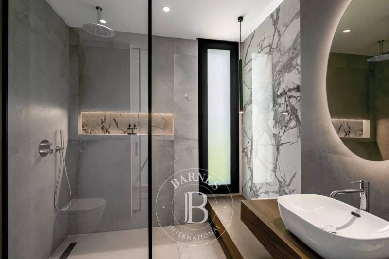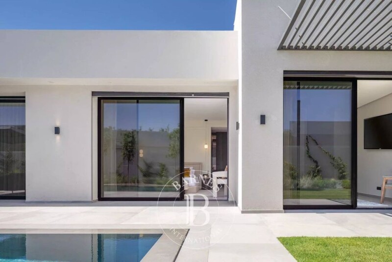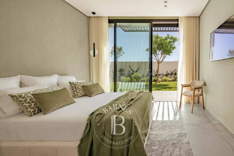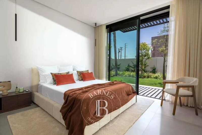 This luxurious estate, located 10 km from the center of Marrakech on the Route de l'Ourika, features 29 high-end villas, including 21 single-storey villas and 8 two-storey (R+1) villas. Each villa is built on plots starting at 1,050 m² with a built surface area of 400 m². The residence offers several shared amenities such as a state-of-the-art gym, a padel court, a children's play area, and parking for guests. The entire complex is fully secured with a video surveillance system and a monitored entrance. The exterior layout of the villas includes a large south-facing landscaped garden with no direct neighbors, featuring an automated irrigation system and night lighting. A heated infinity pool is complemented by a terrace that connects to the large living room and the main kitchen. Additionally, there is a two-car shelter. Each single-storey villa boasts a spacious double living room with a fireplace and a view of the pool, a dining room, an Italian-designed equipped kitchen, 4 suites with dressing rooms and en-suite bathrooms, including a master suite. It also includes a service kitchen and a staff room with a separate access. Designed with a focus on thermal performance, these villas offer optimal insulation for comfort all year round.