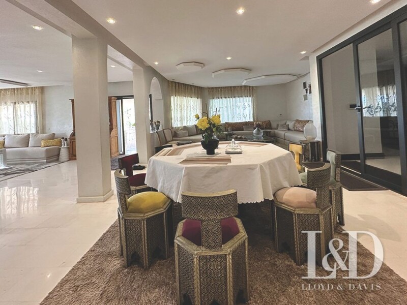 Located in the FOUNTY district, the most popular place in Agadir, more than a luxury villa, it is a small palace (G+2) with a living area of 746 m² on a plot of 1400 m². Direct view of the sea, its plot includes a swimming pool, outbuildings, large covered terraces, garage, service apartment and an independent business premises. The villa offers two secure entrances on the garage side and on the beach side. On the ground floor there is one of the living areas opening onto a superb covered terrace facing the swimming pool, a fully equipped kitchen, a bedroom with bathroom and separate toilets for guests. On the upper floor, a carved door opens onto a large reception room: a typical Moroccan living room decorated with a chiseled woodwork ceiling and a bright dining room with its large rounded bay windows opening onto a terrace on the ocean side. The second floor accommodates the sleeping area: three bedrooms with bathrooms (two with terraces and dressing room) and a magnificent suite with dressing room, bathroom, sea view terrace. The villa has been completely renovated and decorated with high-end materials . It is also equipped with a home automation system allowing in particular remote control of the air conditioning. This small palace represents a sure value in one of the best locations in the city. Fees included of 3.23% including tax payable by the purchaser. Price excluding fees €3,100,000. Not subject to the DPE This property is offered to you by a commercial agent. Our fees: Your Lloyd & Davis Morocco advisor: Nathalie DUPUY - Tel. 0662329180 Commercial agent (Sole proprietorship) RCP 003376586000053.
