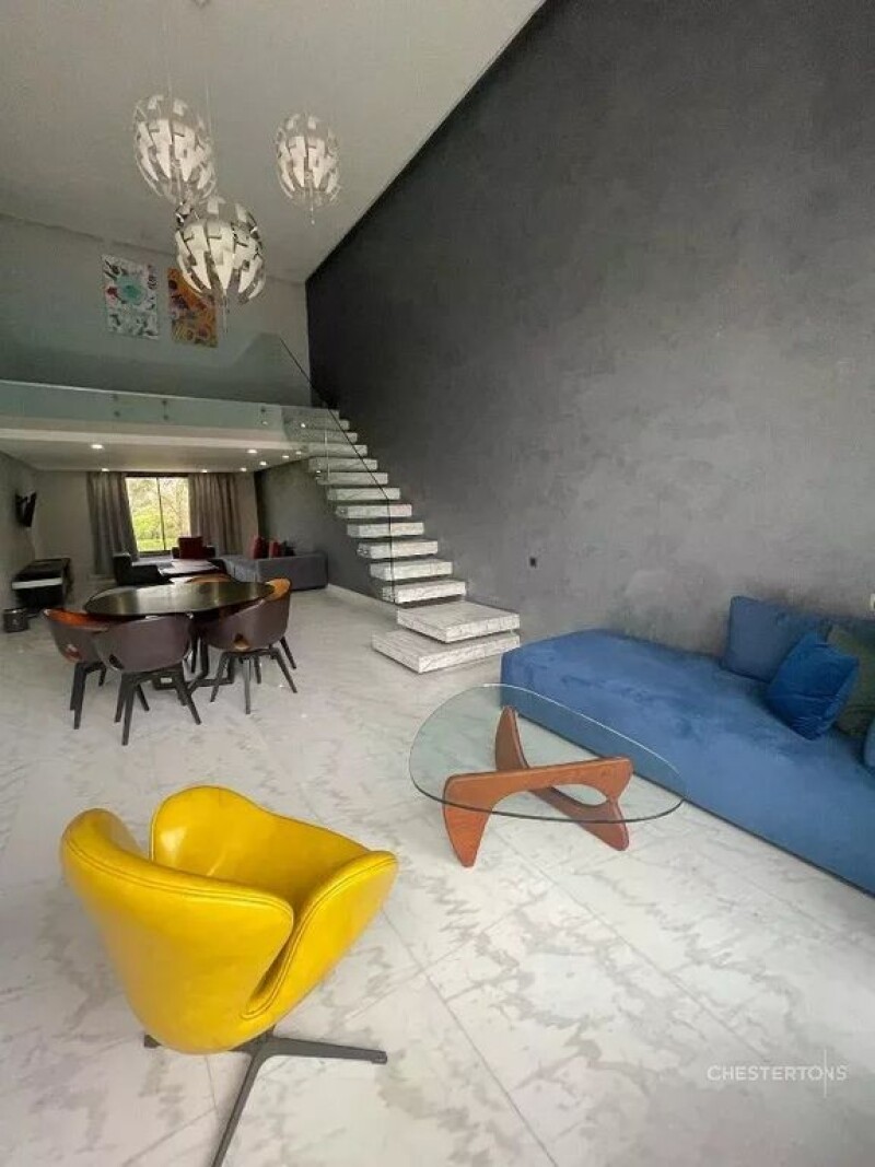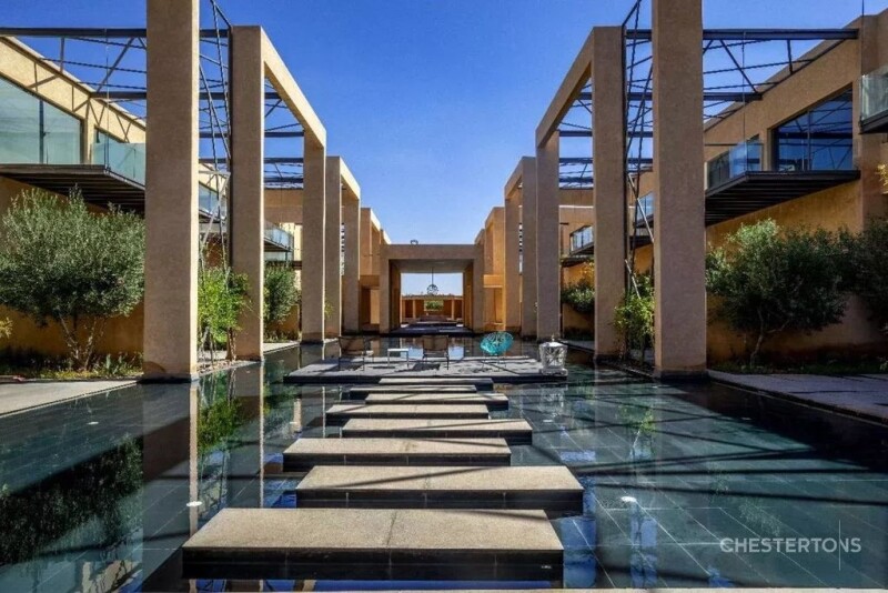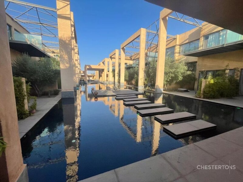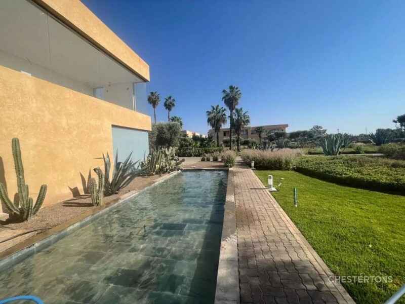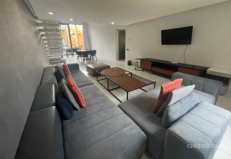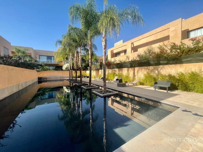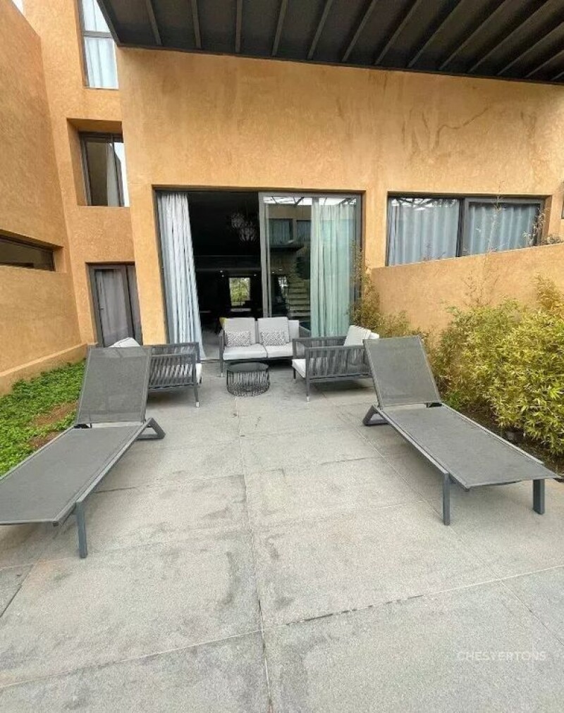 Located about 6 kilometers from the city center of Marrakech, close to the largest and most prestigious golf courses in the city, this magnificent contemporary duplex is part of an exclusive modern and secure residence with a magnificent common swimming pool with its own access. This modern loft fully equipped with high quality furniture is composed of 3 bedrooms, 4 bathrooms, a large living room, a private terrace waterfront and a fully equipped kitchen. All the lofts of the residence are built around a large 80 m long pool composed of relaxation areas and pools with an access to a fitness room.