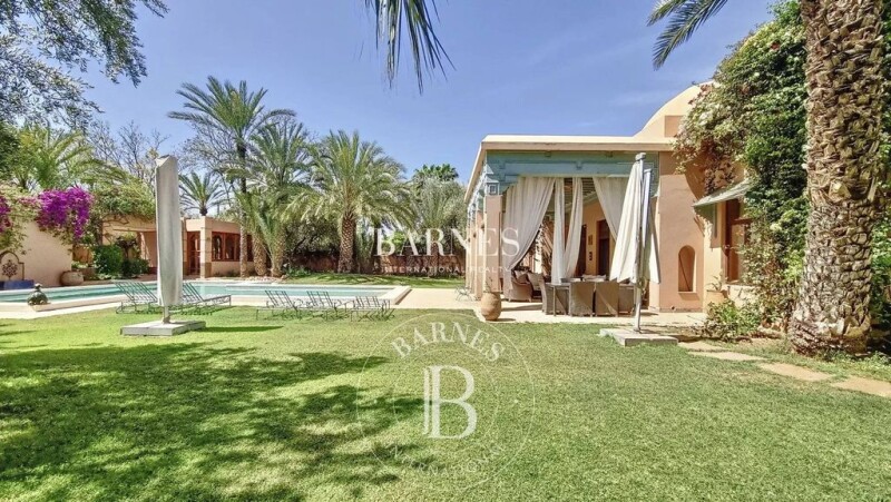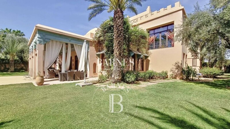 Just a few meters from the golf course, after crossing a charming patio, you will discover this Arab-Andalusian style villa. The villa consists of a double living room, a dining room, an office, a kitchen, and three suites, each with a bathroom and dressing room, on the ground floor. The upper floor features three suites, two of which are master suites. Outside, you can enjoy the large terrace with views of the beautifully landscaped garden, the pool, and its pool house. For relaxation, a full spa with a jacuzzi is part of the property. Two service rooms are also available for staff.