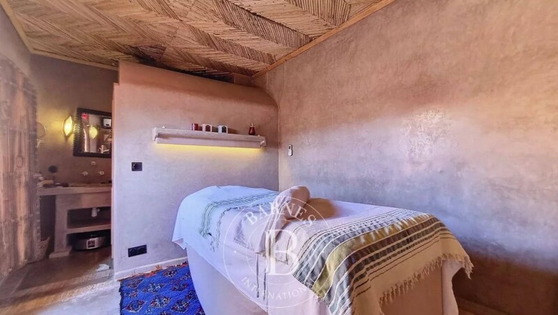 This magnificent, luxurious residential riad with title deed features 4 stunning suites, each with its own private bathroom, and is for sale in a charming alley of the famous "Moukef" district, near parking. Upon arrival, you will be pleasantly surprised by the size of this family home: the spacious rooms, luxurious finishes, noble materials, Moroccan architecture, ample storage spaces, and overall comfort. The riad has been optimized to the fullest with all the amenities you'll find. It offers multiple possibilities for future buyers: a luxurious private residence, or if you're looking for a profitable business, you could live in the douiria and rent out the 3 other rooms, or even use it for exclusive short-term rentals. With a floor area of 170 m² plus a douiria, the riad is laid out as follows: Ground floor: An entry hall (double doors) A beautiful entrance hall (with space for an elevator) A large, bright patio with a heated pool (5m x 1.90m) A master suite A spacious living/dining room with a fireplace (with a heating system like those in castles) A fully equipped kitchen A pantry with a built-in safe Upstairs: Stunning corridors with incredible hand-carved arches, beautiful relaxation areas, numerous storage closets... Two large suites with bathrooms The douiria, transformed into a "Royal Suite," with a living area in an oriental style, a large screen, a fireplace with a heating system like those in castles, and a private terrace. Rooftop: A beautiful large terrace featuring: An outdoor kitchen A gym A guest toilet A laundry room A spa with a fireplace, hammam, and massage room A cedar pergola-covered area A lounge area A storage room An additional solarium terrace with a panoramic 360° view of the entire Medina of Marrakech. This riad has been completely rebuilt by the owner and is technically flawless, equipped with a video surveillance system, reversible air conditioning/heating in all rooms, and luxurious finishes. Presented by BARNES MARRAKECH - Real estate agency Marrakech - Luxury real estate Marrakech - Riad for sale Marrakech.