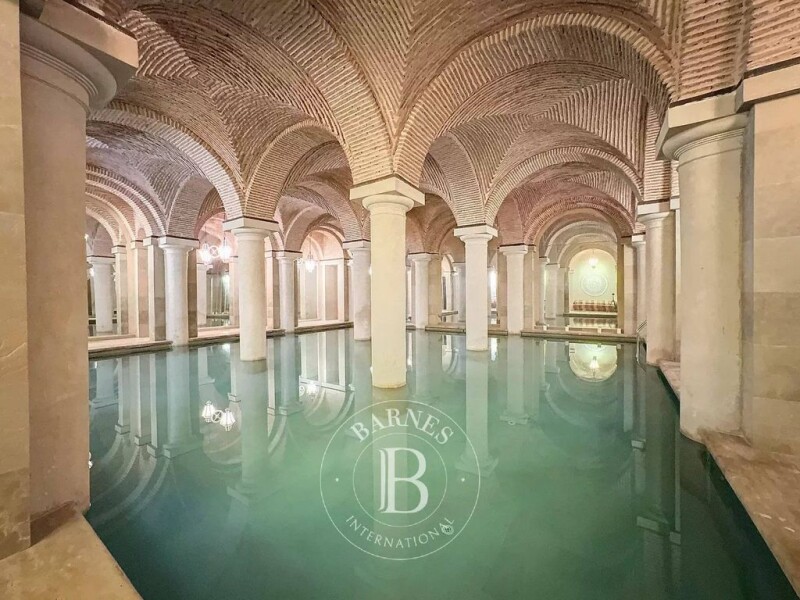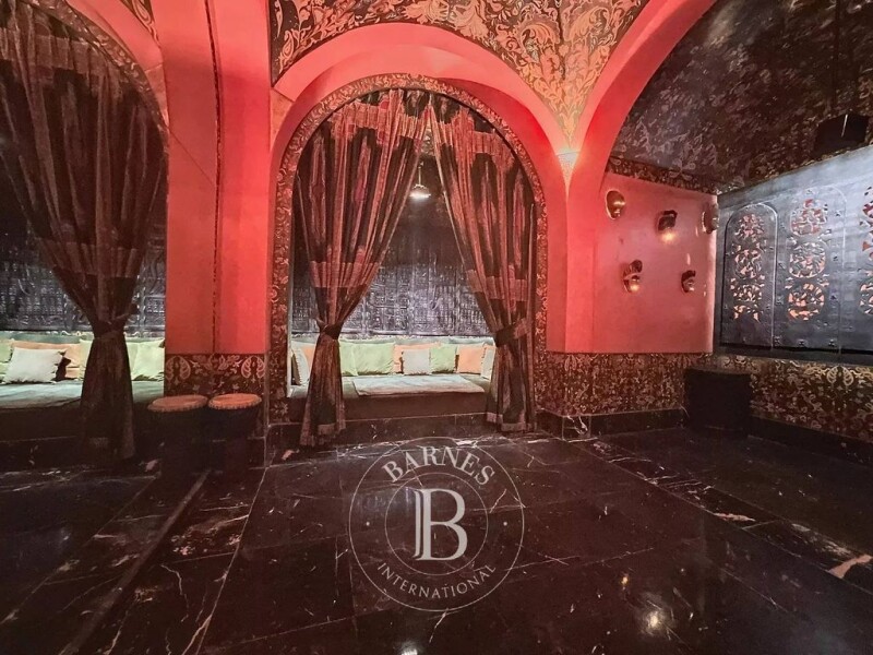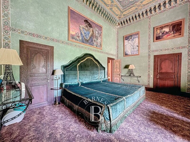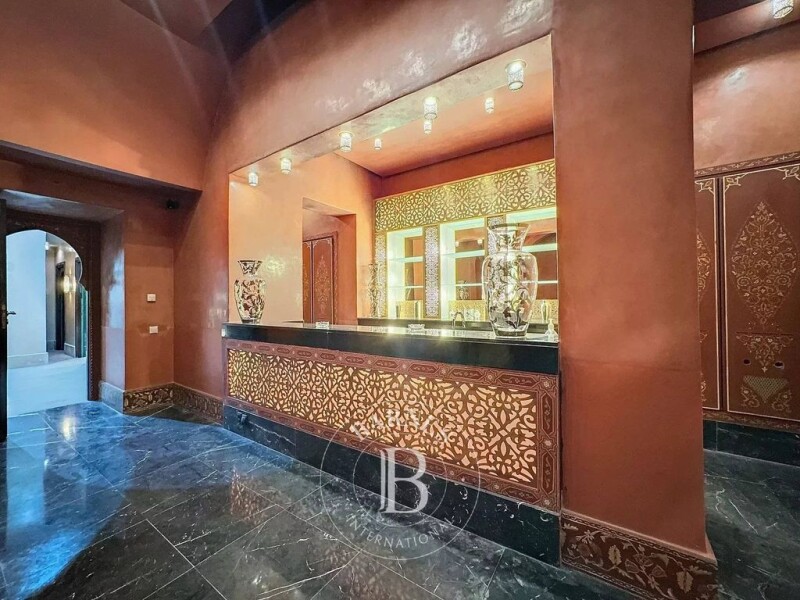 Impressive in its volume, majestic in its beauty, this palace with architecture evoking Andalusia is located in the Palmeraie of Marrakech. With a living space of 1,800 m² on 2 hectares of land, the property consists of several lounges, a library, and an office, a beautiful kitchen, and nine suites, four of which are housed in separate pavilions outside. A spa worthy of "One Thousand and One Nights," with its hammam and heated pool, shares the basement with the bar and nightclub. Its central courtyard with fountains and the lush garden filled with roses contribute to the seamless blend of indoor and outdoor spaces. Finally, a tennis court adds to the wellness features offered by this exceptional property.