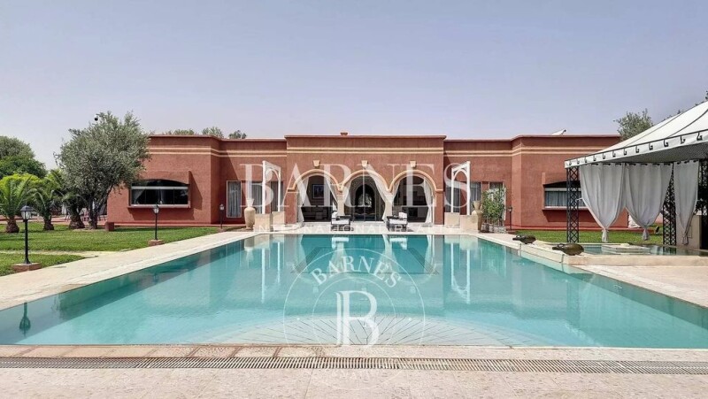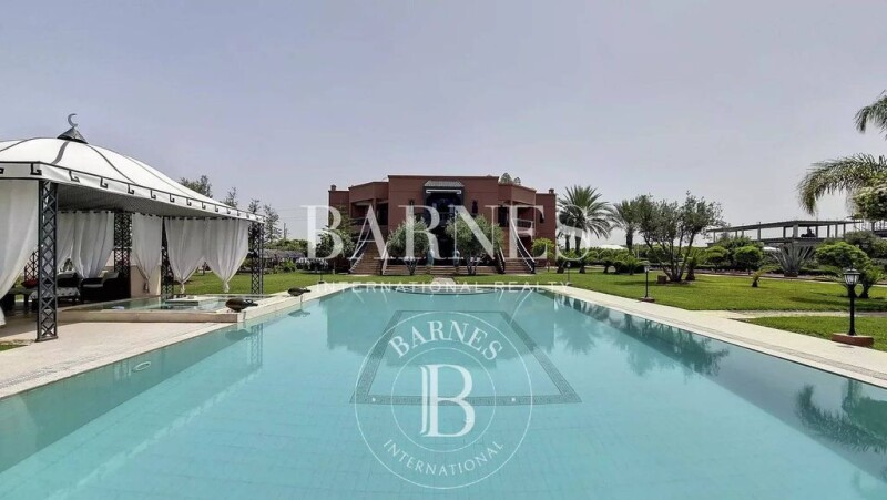This octagonal architecture villa is located on the road to Ourika, 15 minutes from the city center, with a breathtaking view of the Atlas Mountains and can be operated as a guesthouse. The property comprises a main house with seven bedrooms and two suites surrounding a patio with a 10-meter high ceiling. A single-storey pavilion with two bedrooms, a living room with an open kitchen, a Hammam, and a massage room. It also features a 16-meter swimming pool, a jacuzzi, and a beautiful landscaped park.