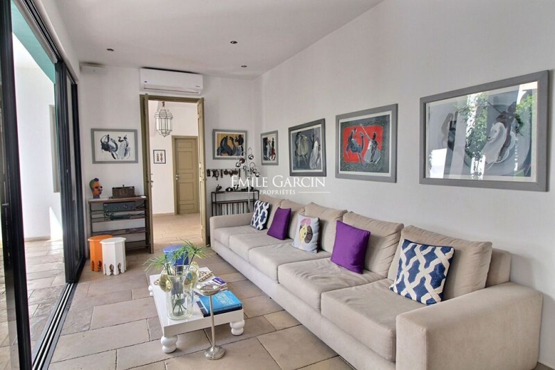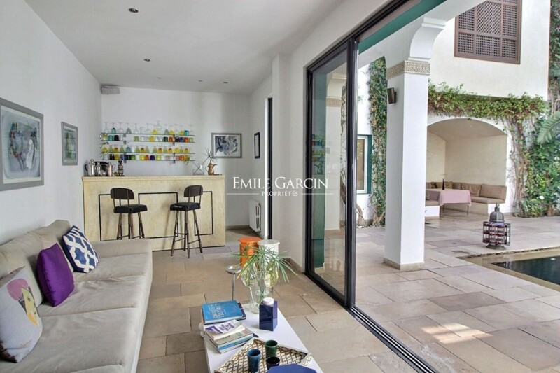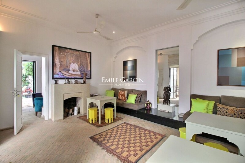 Riad presenting 600 sq.m of living area on a footprint of 320 sq.m. The property consists of a very large patio with 9-metre long swimming pool, a lounge with fireplace, a dining room, a TV lounge, a bar, a kitchen, 4 bedrooms, 4 bathrooms and an extra bedroom. It also offers an adjoining douiria with fireplace lounge, patio, 3 ensuite bedrooms, kitchen and terrace with zellige hot tub and breathtaking view of the gardens. The riad is surrounded by greenery in the most sought-after area of the medina. There is access between the two buildings on the ground floor and on the terrace. The riad currently earns excellent income from being rented out on a seasonal basis.