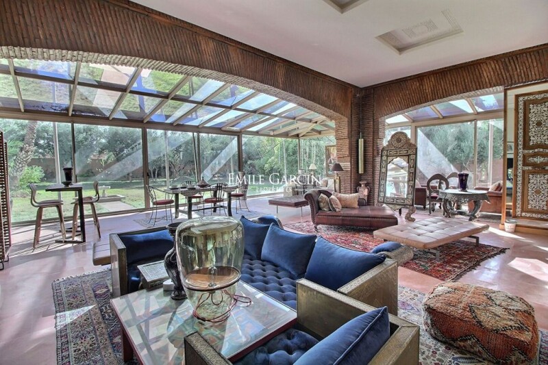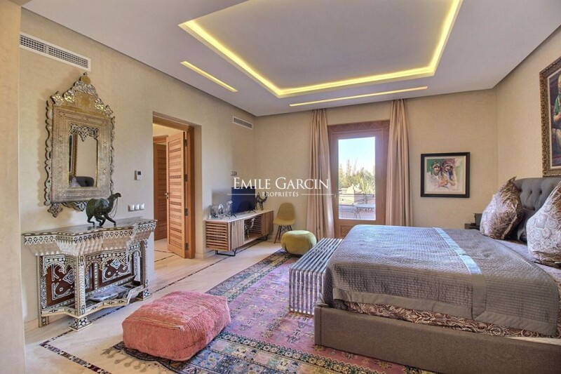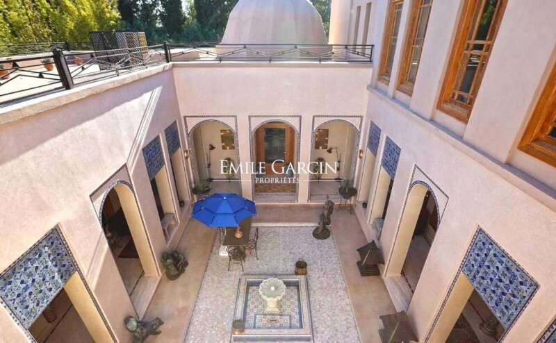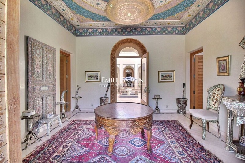 Located in the heart of the Triangle d'or district of Marrakech, this magnificent property presents 1,500 sq.m of living area on a hectare of landscaped grounds. The main house features a large reception area comprising a lounge with fireplace, a games room, a dining room with fireplace, a large veranda lounge and an Andalusian patio. There are three suites on the ground floor and two suites upstairs, as well as a beautiful terrace overlooking the garden. Outside, you will find a reception room, four independent suites, a spa with hammam, sauna and massage room, a gym, a hot tub surrounded by palm trees, several furnished terraces and a beautiful swimming pool. Several outbuildings. Three kitchens. Caretaker's lodge and staff accommodation. Verdant grounds including a magnificent rose garden, fruit trees and palm trees. Excellent quality of construction. This property would make a perfect main residence or guest house.