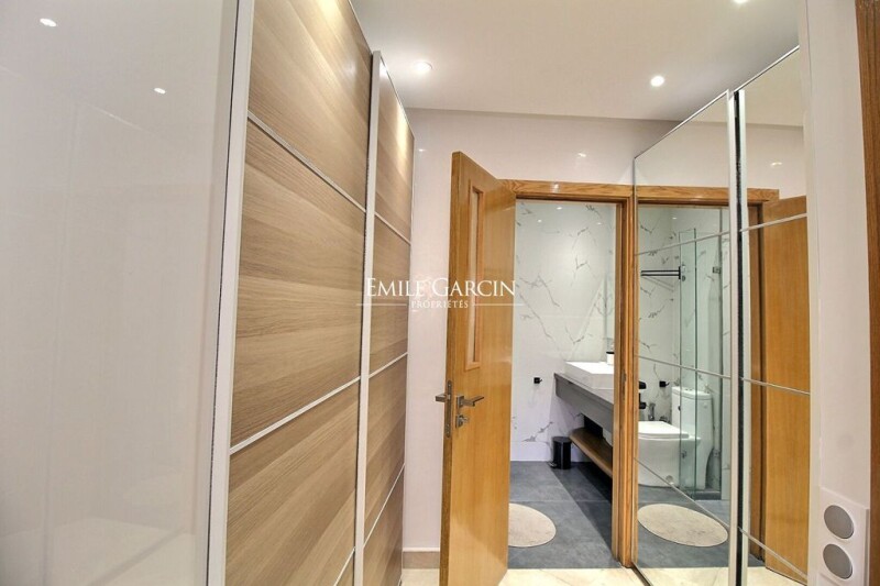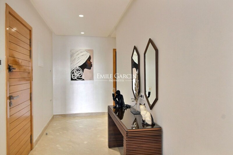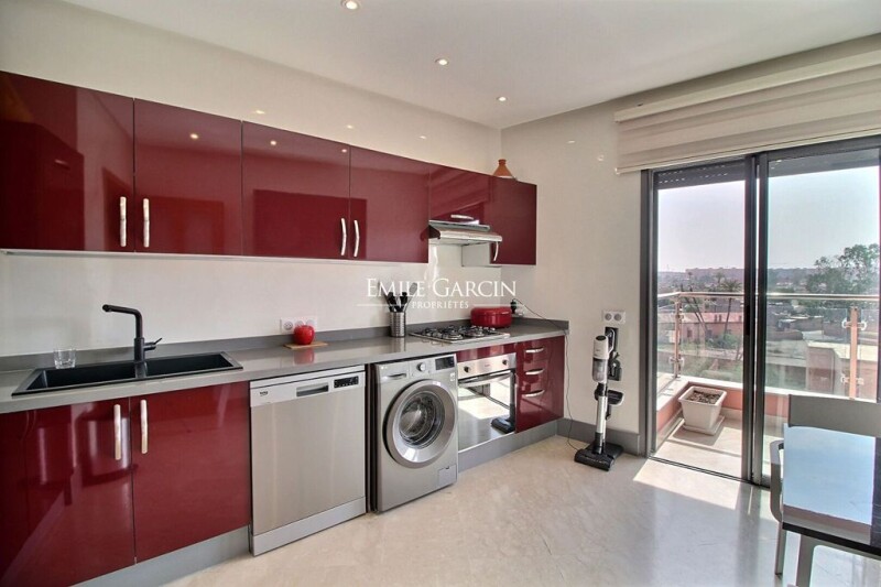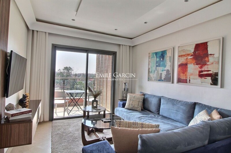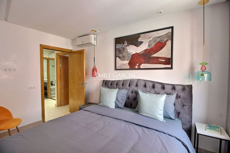 Located on the third floor of a modern high-end condominium, this apartment presents 90 sq.m composed of a living room, a dining room, an equipped kitchen, two bedrooms (including a suite), two bathrooms and a balcony. Not overlooked. South/west facing. This bright and airy apartment is a perfect pied à terre in Marrakech and would also make an ideal rental investment.