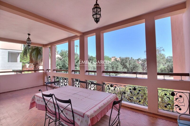Apartment presenting 195 sq.m of living area on the first floor of an excellent building on Avenue Mohamed VI, very close to the Menara Mall. The property is composed of a pretty entrance, a large reception room and terrace with a view of the vast gardens, three bedrooms, two bathrooms, a guest WC, an equipped kitchen and a utility room. Central air conditioning. Reserved parking space. In need of certain renovation work.