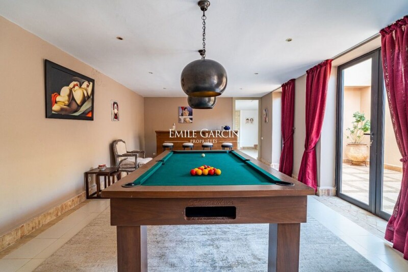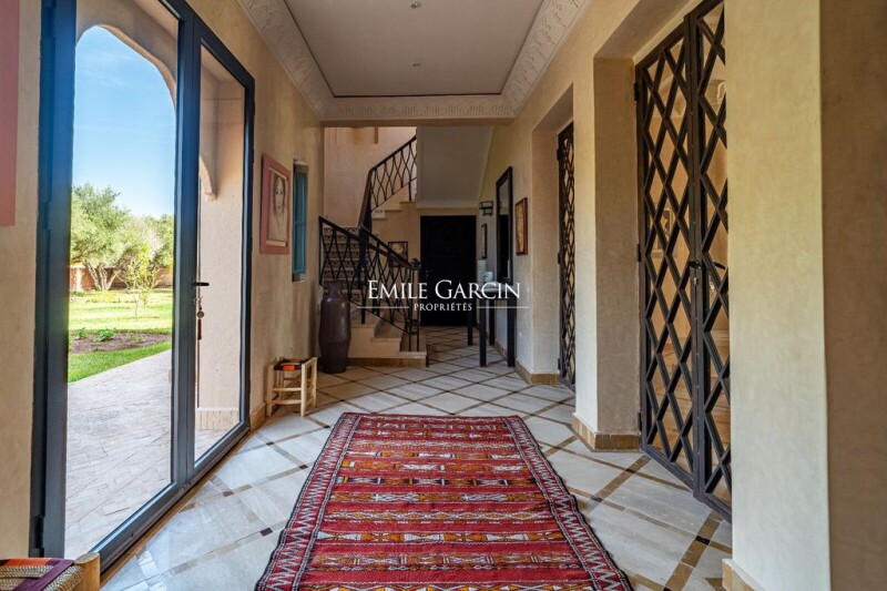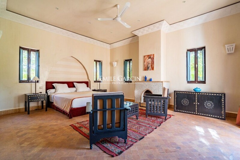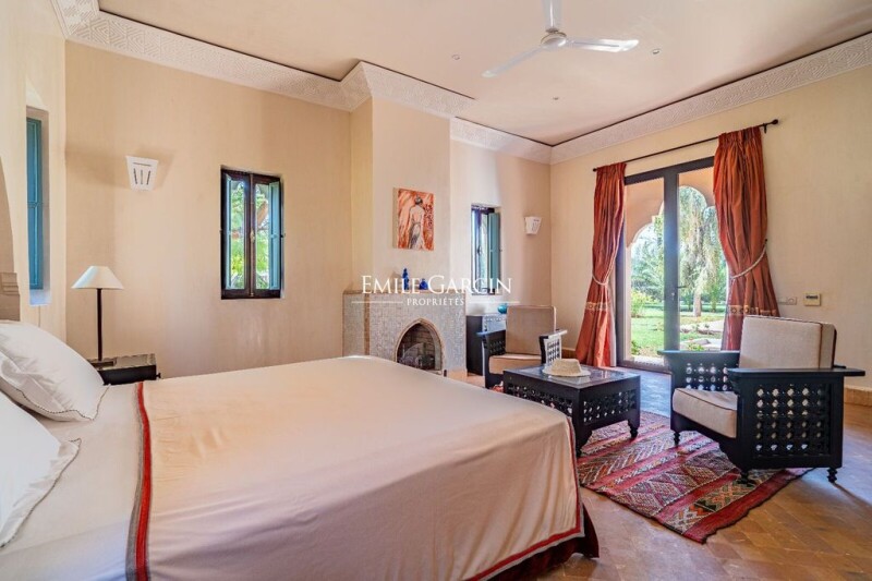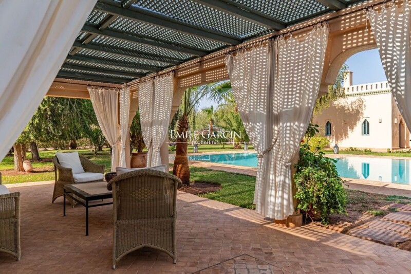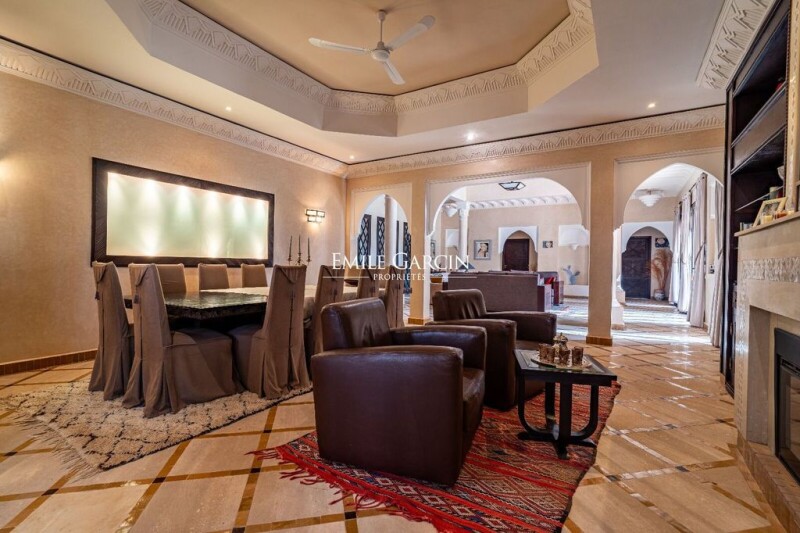 Located 25 minutes from the city center, in a private residence, this superb 500 m² house is built on a beautiful 5000 m² wooded park. It features a reception room with a fireplace, a dining room, a fully equipped kitchen, a billiard room with a bar and lounge, 5 bedrooms, each with its own private bathroom, a jacuzzi, a pool house, furnished terraces, and an infinity pool. This villa combines Moroccan charm and modernity for absolute comfort.