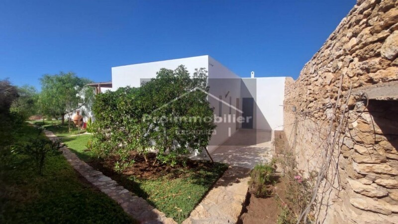 Belle maison style contemporain avec belle vue panoramique sur la campagne de moulay bouzerktoune, 28km d’Essaouira. La maison entourée d’un beau jardin arboré et clôturé d’une superficie de 10000m². La maison plein pied dispose d’une belle entrée avec un salon TV qui a une vue sur la campagne communiqué avec un coin salle a manger….