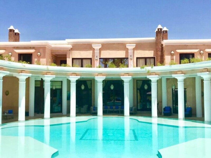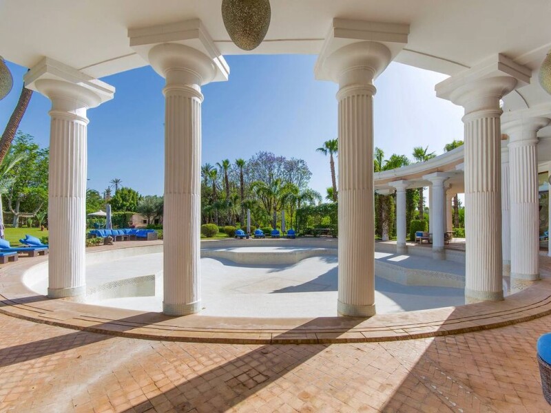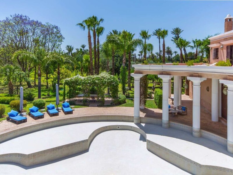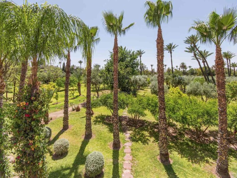 This property built on two hectares is located in one of the best places in the palm grove. 6 km from Mamounia and 10 minutes from Marrakesh Menara Airport, it is surrounded by palm and olive trees with bougainvilleas, laurels and roses. Light filters through the vegetation, highlighting the colors and the scents of jasmine that intoxicates you in the evening. The villa, open to the south by its terraces bordered by columns giving it a Holywoodian character, surround the heated circular swimming pool bordered by a beach welcoming deckchairs. Its large interior volumes give it the air of a palace: the huge living room is distributed in several living spaces and the dining room lit by a skylight is isolated by Fellinian sheers. and the 6 suites all with bathroom, dressing room and terrace allow you to stay pleasantly. An independent guest house, with fireplace lounge, suite and bathroom completes the whole. The kitchen is equipped and independent accommodation exists for the staff. Underfloor heating in the common areas and central in the suites. Reversible air conditioning sheathed in all rooms. The land consists of two land titles of one hectare each. Possibility of building another villa of 900 m2 or 1500 m2 in tourism project on the 2nd hectare. 1.03 hectare Charming property.