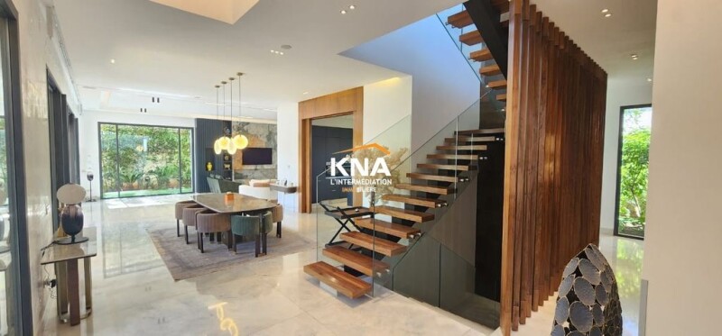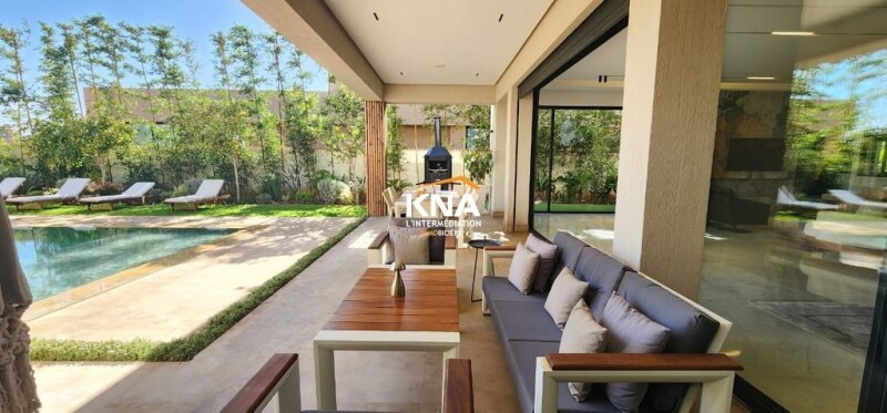 Very beautiful new exceptional villa located in a secure golf complex 15 minutes from the city center of Marrakech Land area: 1,000 m2 It consists of: 1 Pleasant living room with television 1 Dining room for 8 people 1 Large fully equipped kitchen 1 Guest toilet 5 Suites each with bathroom, dressing room, television, terrace, reversible air conditioning Miscellaneous: Large swimming pool Wooded and grassed garden Outdoor living room Outdoor dining room for 8 people Barbecue Well Advantages: Disabled access Double glazing Aluminum window Sliding windows Electric blinds Electric roller shutters Mosquito nets Photovoltaic panels Videophone Video surveillance Outdoor lighting Alarm Safe Digicode Caretaker Unfurnished sale price: 1,600,000 euros.