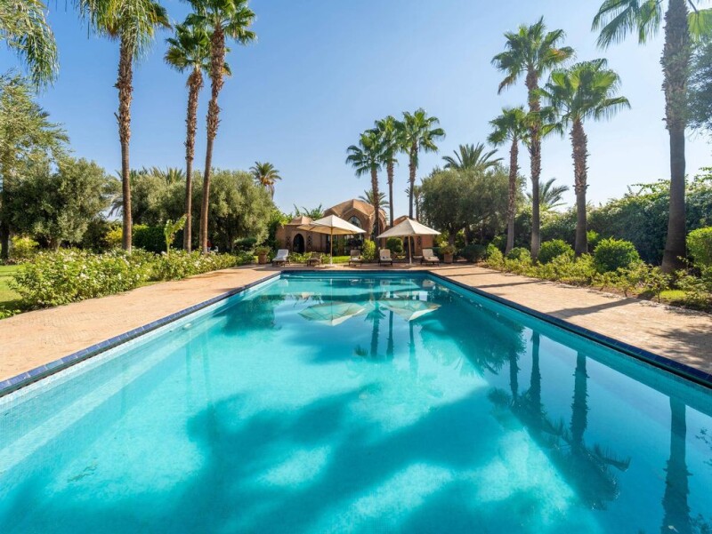 Located in the heart of the Amelkis estate, in one of the most sought-after areas, this 7-bedroom villa is set in approx. 3,800 m² of grounds overlooking the golf course on three sides. This masterpiece was designed by a renowned Marrakech architect. The entrance to the villa leads into a vast Arabo-Andalusian patio. From this patio, you have access to almost all the reception rooms, including the covered lounge opening onto the park, the lounge-library, the vast dining room and, from the latter, the large lounge with its large windows overlooking the park on two sides. A staircase leads from the vast vestibule on the ground floor to the sleeping quarters. The two suites, also accessible by lift, overlook the park. They are complemented by four other large bedrooms with en suite bathrooms and a children's bedroom. A small staircase also leads to the jacuzzi-sauna. The whole, very homogeneous, fully asserts the style of its architect who signs here, one of his most beautiful realizations in a Moroccan style revisited. The grounds, with their vast mature trees and palm trees, include a heated swimming pool and a pavilion comprising a lounge, a hammam and a small kitchen. South-facing, it also offers stunning views of the Atlas Mountains. Other facilities include a large kitchen, service corridors, staff accommodation, cold room, technical area, ducted air conditioning, central heating and solar panels. The Amelkis golf course is a secure residential area close to the town centre and home to a renowned 27-hole course. For more information, please contact David Montérin on +212 6 71 43 72 27.