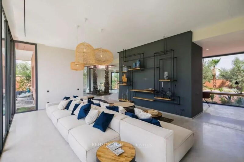 Discover this sumptuous luxury contemporary villa for sale on the Ourika road in Marrakech, offered by our real estate agency. Nestled just 15 minutes from the city, this exceptional property offers a peaceful setting where modernity and tradition meet harmoniously. With a living area of 450 m² on a plot of 2350 m², this villa is a true haven of peace. It consists of 4 suites, each with its own bathroom or shower room and a dressing room. The interior, subtly decorated with noble materials and Berber touches, offers a spacious living space including lounges, a dining room and a fully equipped modern kitchen. A ducted air conditioning system is also pre-installed for your comfort. Outside, a garden beautifully landscaped by a renowned landscape architect surrounds a 15x4 meter infinity pool. The sheltered pool house and Bali stones provide an exotic and soothing atmosphere. The technical specifications of the villa include aluminum double glazing, oak doors and joinery, pre-installation for underfloor heating, pre-installation for a heat pump for the swimming pool, as well as reinforced insulation for the roof terrace and the walls.