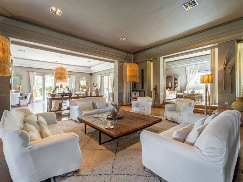 Ideally located on the Ourika road, 15 minutes from Marrakech, this charming property of approximately 1.000 m ² with 9 bedrooms on over 5.200 m ² of land is nestled in a perfectly maintained private estate of 10 villas which benefits from a SPA and a paddle tennis court. The main villa consists of 6 bedrooms with bathrooms, including a 70 m ² master bedroom upstairs with a large terrace and views of the Atlas Mountains. The living spaces are very generous and consist of an entrance hall open to the living room and dining room in perspective, flanked on either side by a bar area, a television lounge, and a professional kitchen. Large windows allow views of the garden. In the garden are the 3 independent pavilions of 50 m ² each, each consisting of a bedroom with a dressing room, bathroom, and private terrace. The various outdoor spaces are warm and well-appointed. A terrace with a Moroccan lounge enjoys the atmosphere of the orchard with its fruit trees and rose garden. A courtyard with a fountain for breakfast in the sun. An outdoor lounge overlooks the 60 m ² heated swimming pool, followed by a very well-equipped bar and a petanque court. The atmosphere of the property is very pleasant thanks to indoor and outdoor sound systems. Other features: Central heating, air conditioning, staff accommodation, storage, laundry room, automatic irrigation, etc... For more information, please contact David Montérin at +212 6 71 43 72 27.