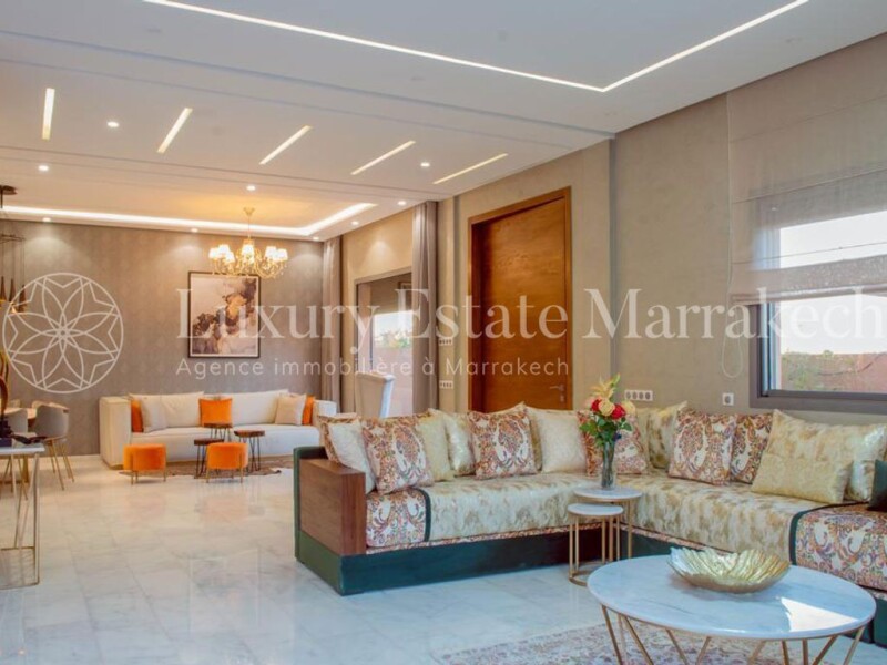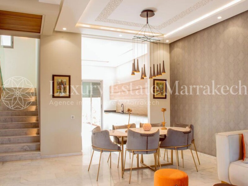 The project is a guarded residence of 54 semi-finished villas with an area between 250m² and 450m². offering a very efficient strategy of urban and technical architectural solutions. -This area is located in the heart of vast green spaces next to a golf course 8 minutes from Boulevard Mohamed 6 and 4 minutes from Oasiria Park. -Surface of 127m² covered on the ground floor, designed in a clear and functional way favoring open spaces with a view of the garden and swimming pool. -Surface of 147 m² covered upstairs consisting of four large suites each with its own bathroom. - Accessible terrace with an area of 147 m² with a breathtaking view of the Atlas. -4 bedroom semi-detached villa upstairs with swimming pool. -Price 290,000 EUROS FINISHED unfurnished.