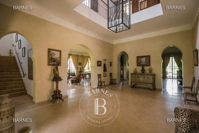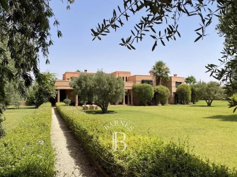 Beautiful villa nestled in the middle of a vast park of over 3 hectares of land, including olive trees, fruit trees, and landscaped gardens, offering breathtaking views of the Atlas Mountains. Located near one of the newest and most sought-after golf courses in Marrakech, this Moroccan-style and art deco property with European comfort is presented as follows: Entrance to a patio hall that leads to a large fireplace living room and a dining room with a fireplace, all overlooking a large furnished terrace area, a large equipped kitchen around a tree-filled patio. There is a TV room with a fireplace as well as a billiards room, 2 bedrooms with bathrooms and dressing rooms, and a large master bedroom with a desk, large dressing room, and bathroom. On the 1st floor are 2 beautiful bedrooms with bathrooms and a lounge, as well as a set of covered or uncovered terraces. The villa has a beautiful pool with a pool house, a large garage, and various accommodations for staff. The materials are of high quality, with central heating, air conditioning, and beautiful finishes.