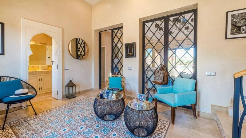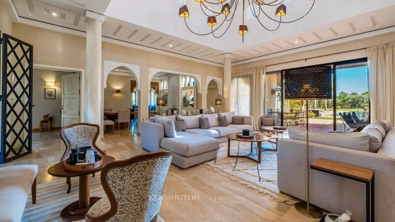 Located about twenty minutes from downtown Marrakech, on the famous road to Fez and with a panoramic view of the Atlas Mountains, the Freesia villa is part of a new high-end residential complex made up of 19 villas. . Inspired by luxurious, calm and secure residential neighborhoods, the landscape architecture of this area offers, paradoxically, a feeling of voluptuousness, large spaces and intimacy. In harmony with its natural environment, circulation within the complex is ensured by vast paths accompanied by cycle paths. Villa Freesia is the best this private estate has to offer. Thanks to its volumes, its concern for space and exposure, its spirit and the luxury it inspires, its charm is absolute. With a living area of 480 m² and built on a plot of 5,409 m², this villa is made up of 1 master suite with dressing room and bathrooms, 5 suites with wardrobes and private bathroom, and individual terraces, a double reception with living room and dining room, a kitchen and guest toilets on the ground floor. In the basement, you will find a service room with a bathroom, a massage room as well as a hammam and a bathroom and toilet, a laundry room, a storage room, a gym under a canopy. The garden is accompanied by several furnished terraces, a swimming pool, a pool house, an office, a technical room, and a garage. As soon as you enter the residence, a feeling of tranquility and well-being will overwhelm you thanks to the modern and tastefully designed general architecture. For more information, or to arrange a visit, do not hesitate to contact us.