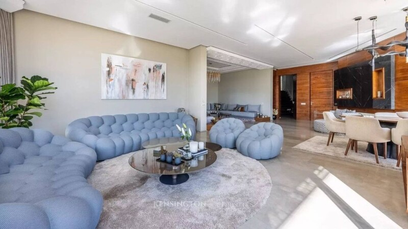 Villa Adila is a beautiful modern house, freshly renovated, located 10 minutes from downtown on the road to Tahanaout. Within a secure golf residence, Villa Adila stands out with its clean and contemporary lines. Built on a surface of 600 m², with beautiful heights under the ceiling and openings on the beautiful outside. The villa is on the first line of the golf course offering a clear view of the Atlas Mountains, which gives it a breathtaking landscape. At any time of the day, and especially during sunsets, the unique view offers a dazzling light show. Villa Adila is spread over 4 levels, with beautiful reception areas on the first floor, and 3 bedrooms and a suite on the first floor. Do not hesitate to contact us if you wish to have more information, or to arrange a visit.
