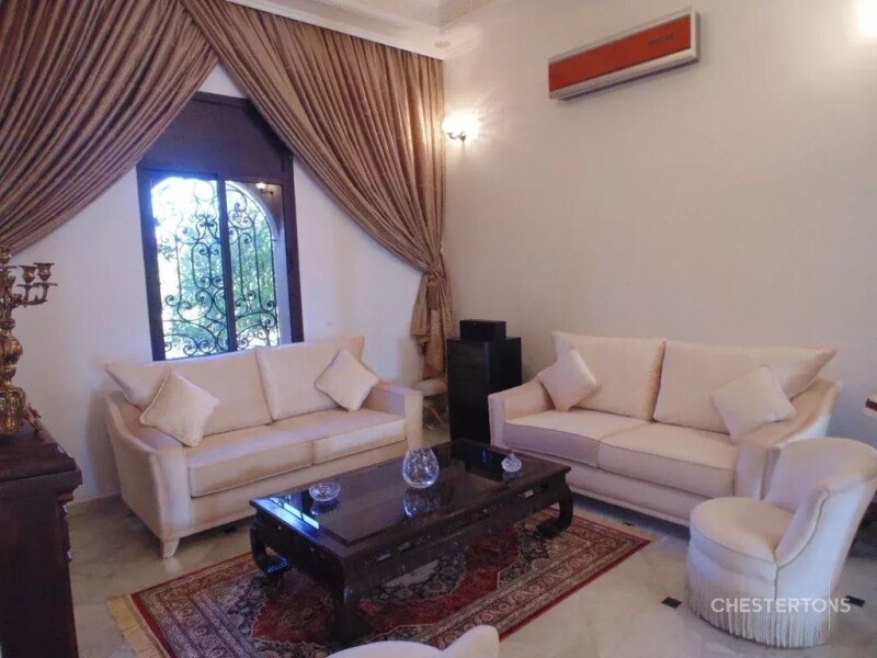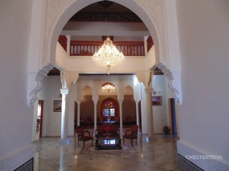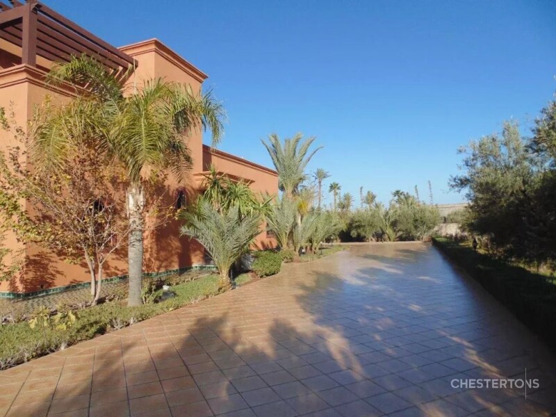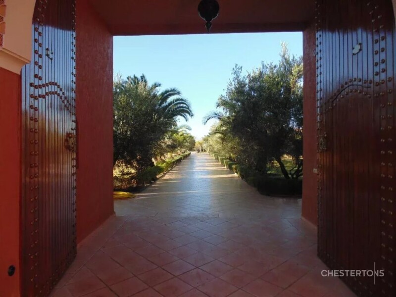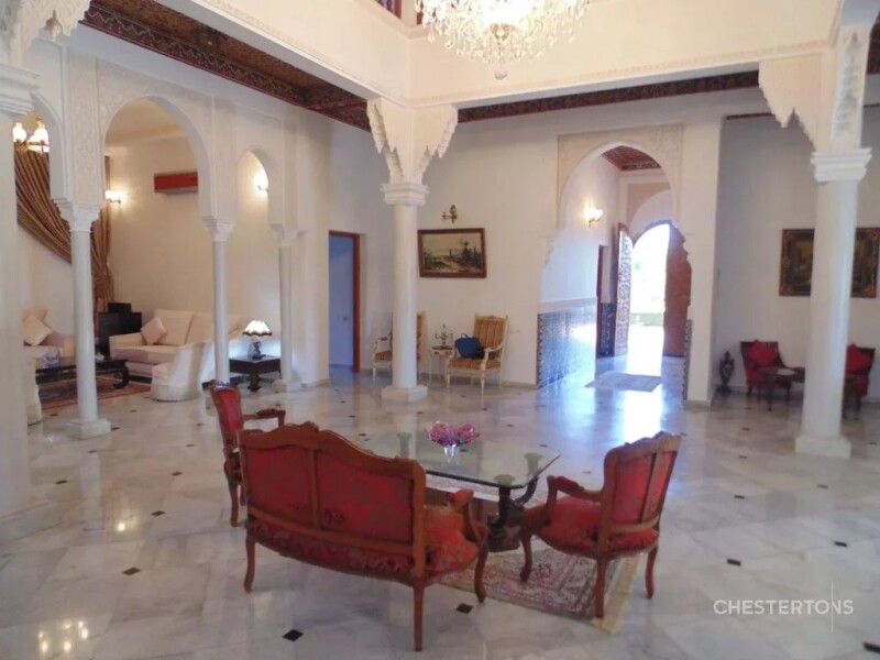 This luxurious villa of 600 m2 is nested in a parc of one hectare, in the district of Bab Atlas (recognized as the new circuit of the Palmeraie). At the entrance, there is a huge pathway surrounded by gardens with olive trees. The villa was built and decorated in the style of the riad, while benefiting of the comfort of modern materials. This magnificent residence has 3 living rooms on the ground floor, 2 of which have a fireplace, four bedrooms, with bathroom, and a huge master suite with 2 private terraces on the first floor. The villa has a very large outdoor terrace of 400 m2 oriented to the Atlas and a covered terrace with a stone barbecue. The kitchen of 100 m2 has two accesses: one on the parking for deliveries, and one on the main terrace. This property is also composed of two fully equipped studios for the staff and a parking.