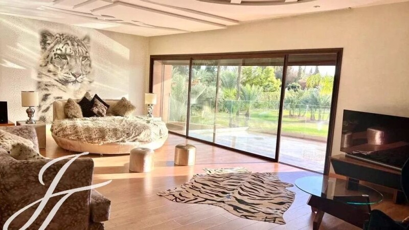 This magnificent estate is enviably located in the most soought after part of the exclusive Palmeraie, a mere 5 minutes from downtown Marrakech Set on a meticulously landscaped 1 hectare park, the grounds include the villa with modern lines and a dramatic 500 sqm swimming-pool. Spanning 1 450 sqm of living space across multiple levels, every corner of this home exudes sophistication and grandeur. The 650 sqm ground floor, adorned with a grand Moroccan lounge and multiple European-style living areas with a spacious kitchen is perfect for both intimate gatherings and lavish entertaining. It also comes with 2 first suites. Ascend to the first floor where you will find an additional 400 square meters of living space, including four beautifully appointed bedrooms, each boasting private balconies overlooking the lush surroundings. The basement living areas of 400 sqm include a second kitchen, a spa with hamman, 3 additional bedrooms, staff quarters and the garage. Whether you seek a private retreat or a luxurious venue for hosting guests, this property promises an unparalleled lifestyle experience.