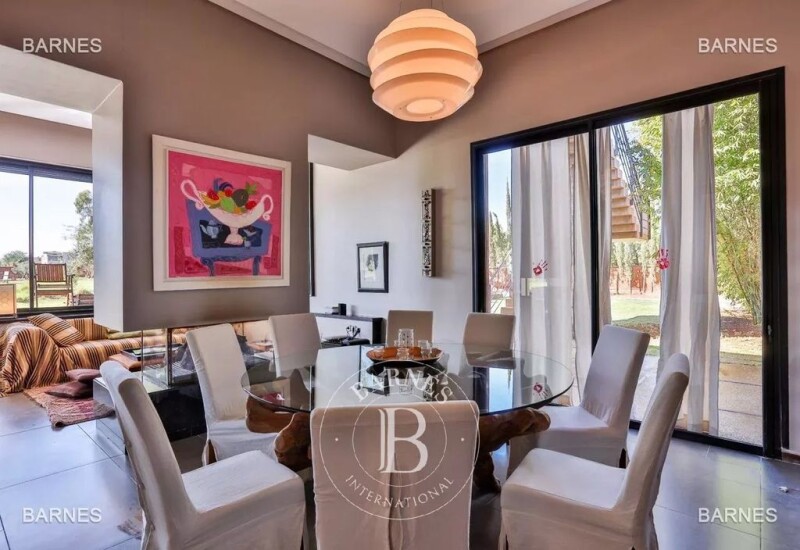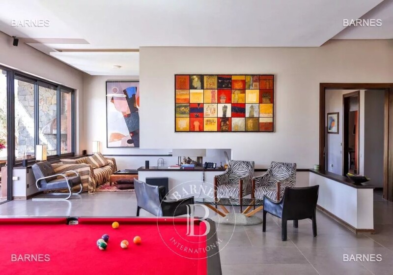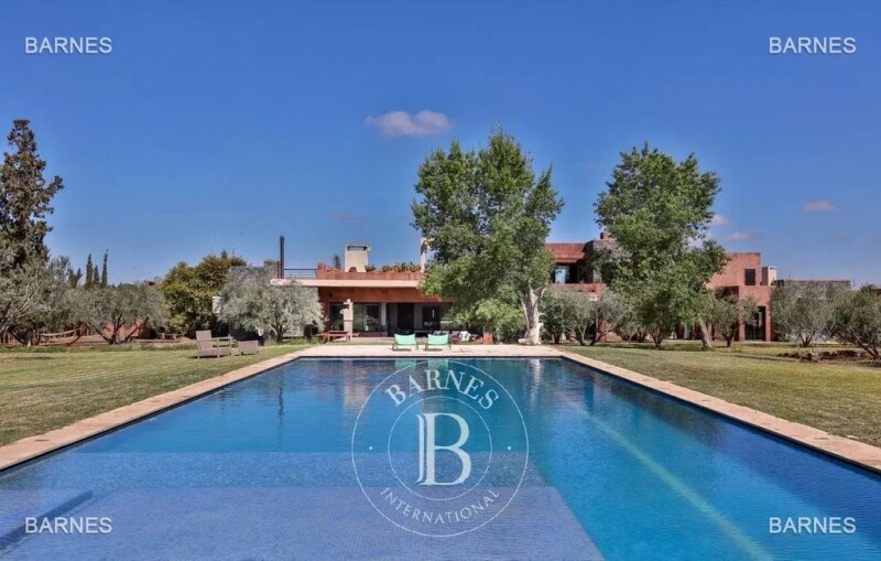 Facing the Atlas Mountains and located about 15 minutes from Marrakech, this beautiful architect-designed villa is set in a 2-hectare olive grove. It comprises a large reception room with fireplace, a Moroccan-style living room, a dining room, all opening onto large shaded terraces, one master suite, three beautiful bedrooms with bathrooms, an apartment, an equipped kitchen, an office, and an outbuilding. There is a stunning 25-meter swimming pool, a tennis court, and a pavilion with sauna, hammam, and gym. The villa also benefits from central heating and reversible air conditioning.