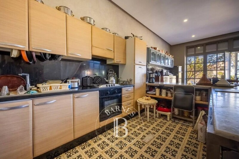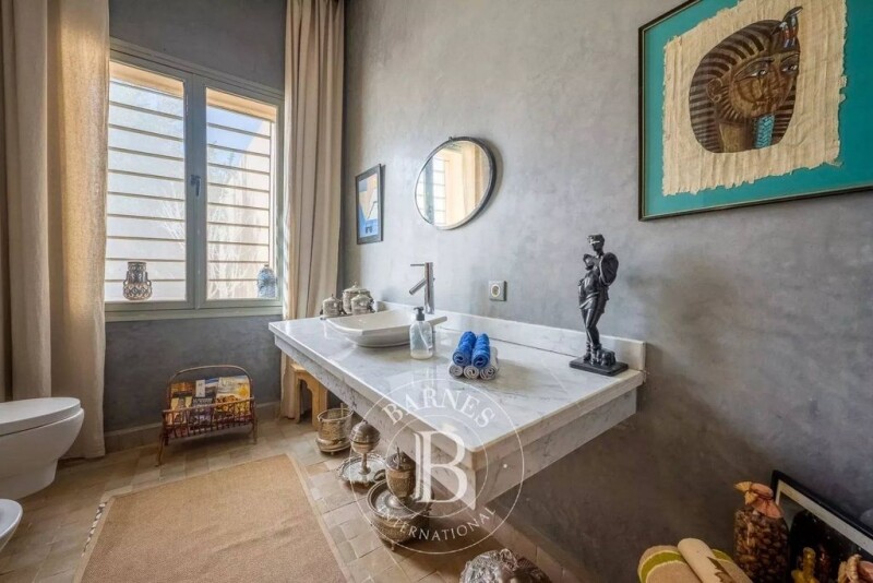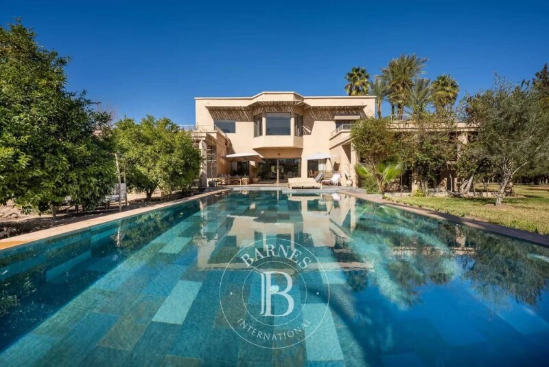 Ideally located on the road to Fez, just minutes from the bustle of Marrakech, this sumptuous boutique property spans nearly 4,900 m² of land, offering an enchanting setting where luxury and nature blend perfectly. Upon entering, the refined architecture and generous volumes of this two-story villa captivate with their harmony and brightness. The ground floor opens onto a majestic triple reception room bathed in light, enhanced by large bay windows overlooking a vast terrace and a sparkling swimming pool. An elegant dining room and a fully equipped kitchen with pantry complete this living space, designed for comfort and conviviality. On the sleeping side, two master suites offer absolute refinement, each with its own private bathroom and dressing room. One of them features a personal sauna, a promise of relaxation and well-being. Upstairs, three superb bedrooms with en-suite bathrooms and private terraces offer breathtaking views of the lush vegetation and the majestic Atlas Mountains. A true sanctuary of well-being, the villa houses an exceptional spa area including a heated indoor pool, a jacuzzi, a massage room, and a hammam, inviting you to escape and serenity. The garden, a veritable green setting with no overlooked vis-à-vis, is adorned with century-old trees and fruit trees, offering a peaceful and intimate atmosphere. Independent staff accommodation, consisting of two bedrooms and a laundry room, guarantees discreet and efficient service. Combining timeless charm and modernity, this property benefits from optimal energy autonomy thanks to a 120-meter-deep well and a high-performance system of 43 photovoltaic and solar panels. A rare place, where elegance, comfort, and nature unite for an unparalleled living experience.
