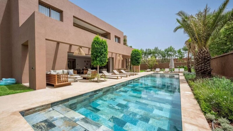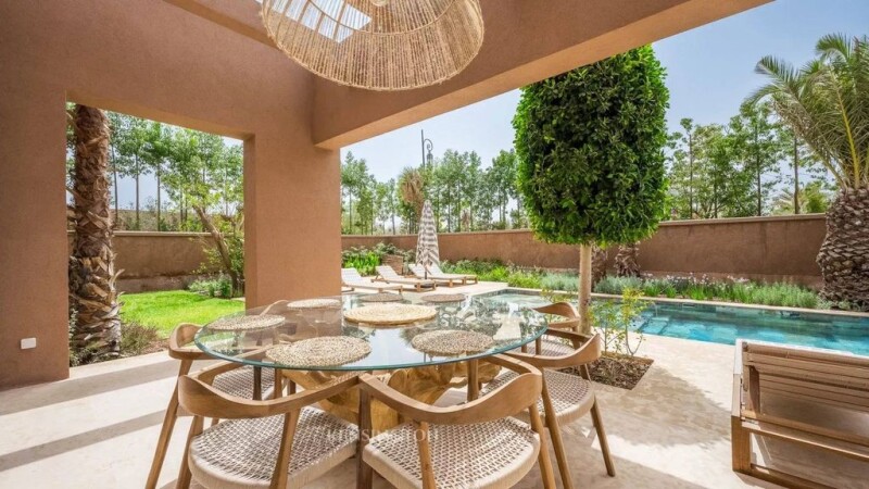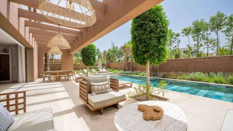 Superb villa located near the prestigious Golf Amelkis, built on 1000m2 of land and with a built-up area of 420m2. On the ground floor, the villa has four bedrooms, each with its own bathroom, a spacious living room and living room, a modern kitchen with pantry, guest toilet, as well as 'a beautiful terrace overlooking a garden and a swimming pool. Upstairs, you will find a very large master suite consisting of a bedroom, a dressing room, an office, a bathroom, and a large terrace offering a pleasant view. The villa's amenities include parking, a multipurpose room that can be arranged according to the wishes of the future owners, a protective cover for the swimming pool, a heat pump to enjoy it all year round, and solar panels for autonomous power supply. energy during the day. This villa combines elegance, comfort and modernity and Moroccan architecture in a subtle way in a calm and secure environment, near the Amelkis Golf Course.