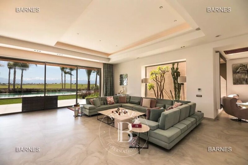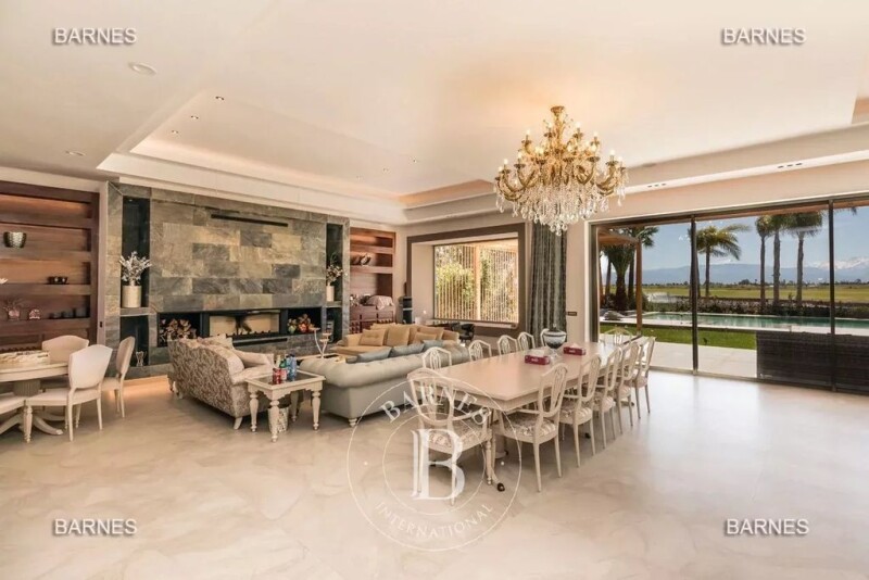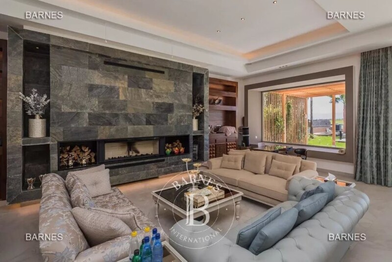Impressive modern residence on the first line of the Amelkis golf course, built on a beautiful plot of 2200m2 facing the Atlas mountains. The villa is built on 3 levels, with a spa area including a hammam, sauna, gym, party room, and home cinema in the basement. On the ground floor, a spacious living room of 200m2 opens onto the pool and golf course through large bay windows, along with a guest bedroom. Upstairs, 5 beautifully furnished guest bedrooms with terraces and en-suite bathrooms. Outside, a heated infinity pool with an integrated jacuzzi offers stunning views of the golf course and Atlas mountains!! The villa is sold fully furnished.