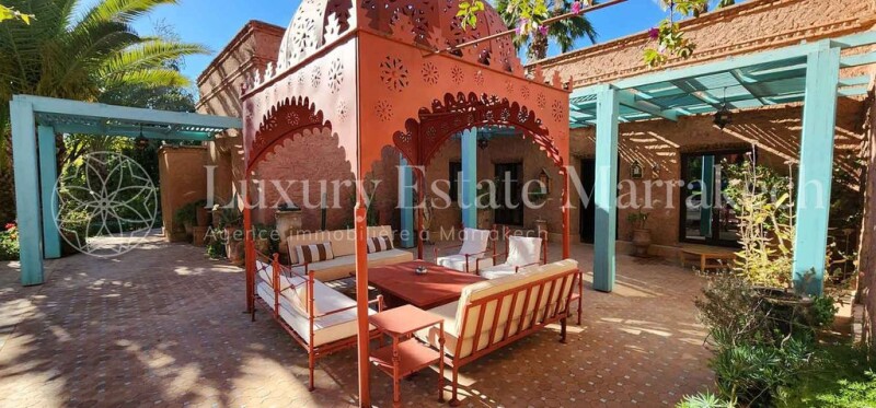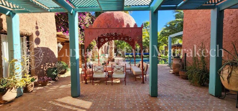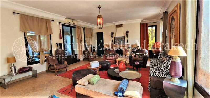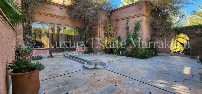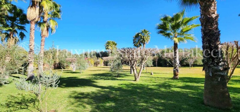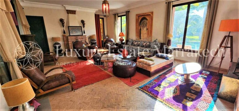Charming villa, beldi chic, 270 m2, 5 bedrooms, on 8000 m2 park, heated swimming pool, hammam. This villa has an exceptional mature wooded park, possibility of adding additional rooms, type "Bungalows" for a potential guest house operation. The villa is on one level, possibility of adding a floor for more bedrooms. Ground floor; – 1 large living room with fireplace – 1 dining room – 1 kitchen – 5 bedrooms with bathrooms – 1 guest toilet – 1 “Beldi” Hammam Equipment: – 100 solar panels (installed 2 years ago) – Heated swimming pool of 15m x 12m – 1 transformer of 30 KVA – 1 well – 1 shed that can be converted into a sixth bedroom – 1 car park with 4 spaces – 1 personal space.