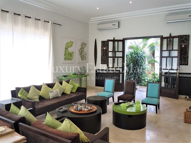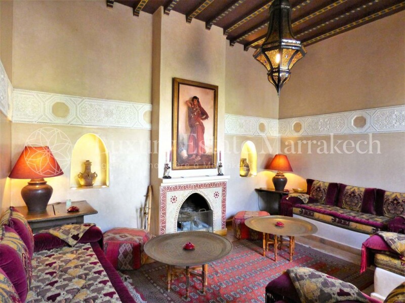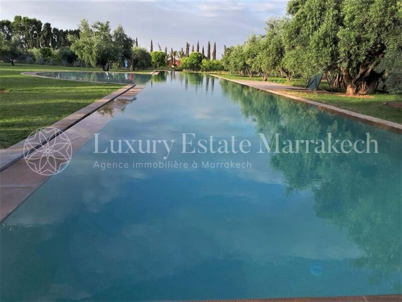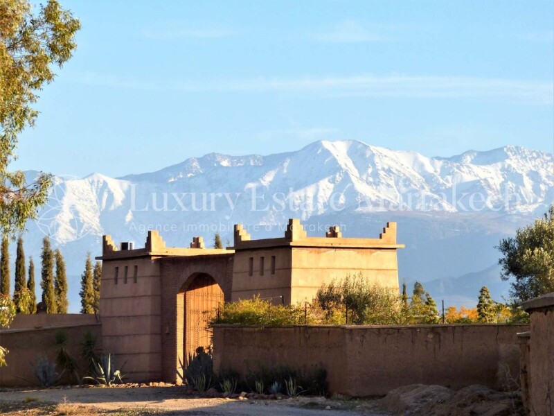 Charming villa with 8 bedrooms, with VNA, on 3 hectares, on the road to Ourika, swimming pool, tennis. This villa has a mature wooded park with a beautiful view of the Atlas. It is located in a quiet area, sought after in particular for its tranquility and its spaces. The villa is ideal for a guest house type operation. The villa has the VNA. Main villa: – a double patio with tadelakt arcades – two living rooms with fireplace – a Moroccan living room with fireplace – a Bhou – a kitchen with office – 5 bedrooms with bathroom – a guest toilet – personal space – laundry area Borj: – two living rooms – a furnished courtyard – 2 bedrooms with bathroom – a garden kitchen: – a pergola in front of the swimming pool – a Caidal tent of 70m2 with bedroom and bathroom – an infinity pool of 33mx 5m – a tennis court in clay – a chidren's corner Equipment: – two 300 liter boilers for water and gas for central heating – fiber internet – anti-limestone system – a petanque court – a caretaker's house – a well and a borehole . Close to Marrakech, 20 minutes from the city center, quiet, not isolated, magnificent view of the Atlas chain.