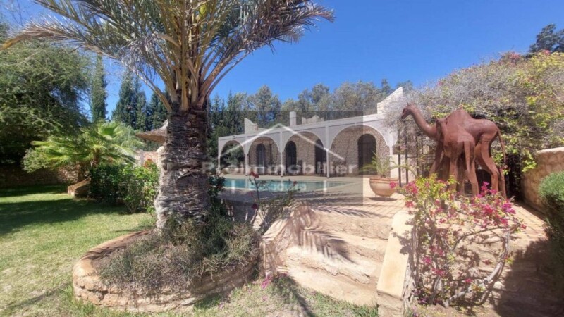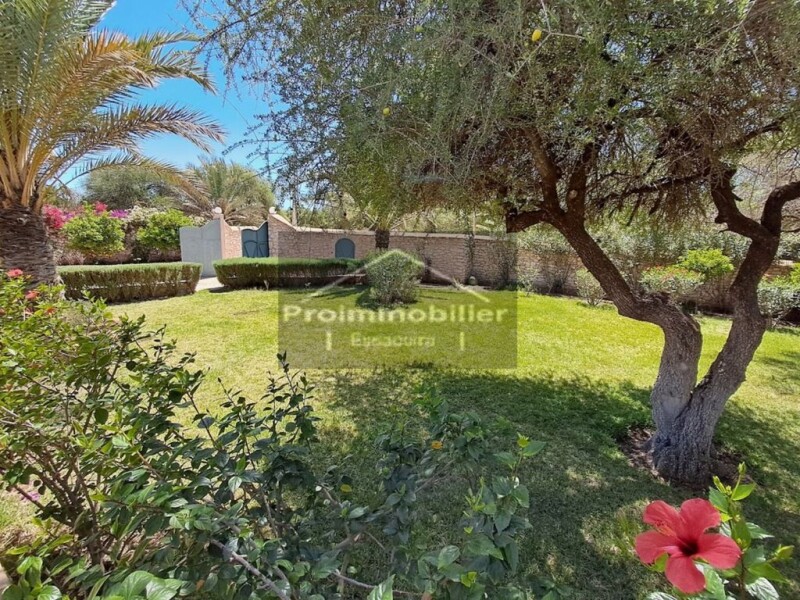 Belle maison à vendre à Essaouira Beautiful property sold furnished, with a house and an independent studio. The main house has an entrance which serves an office, a guest toilet, a storage space, then we arrive on a closed patio with a fountain, organized around there is a dining room with fireplace and air conditioning ,….