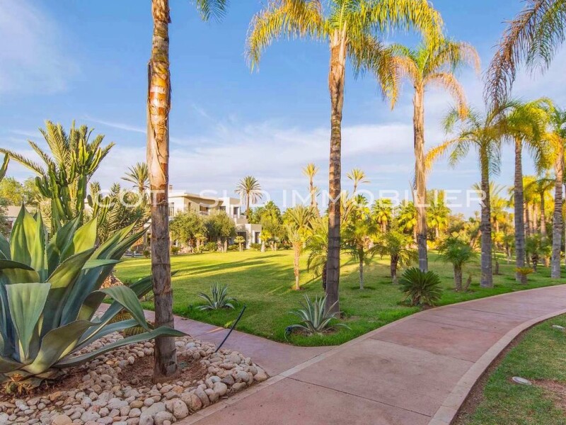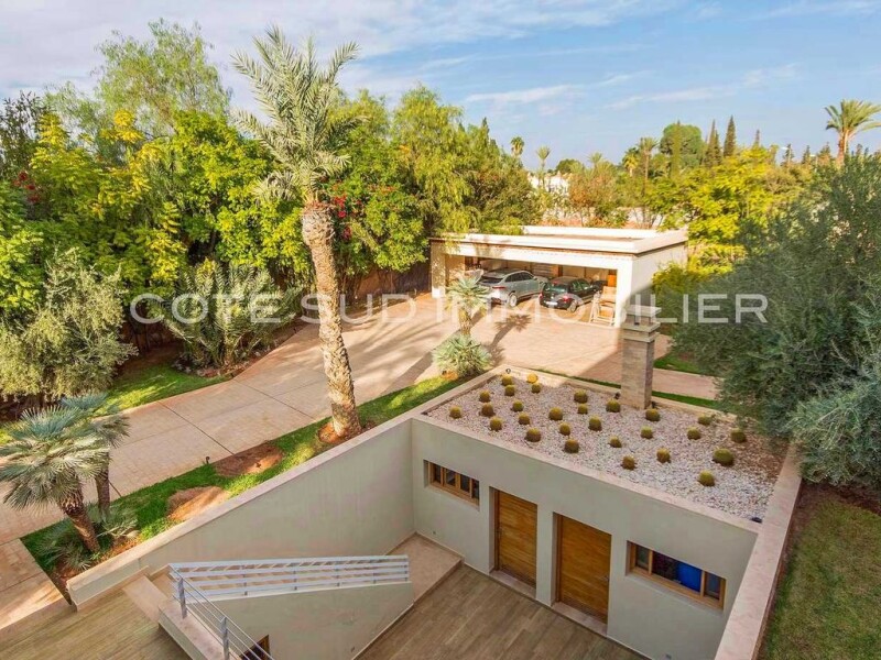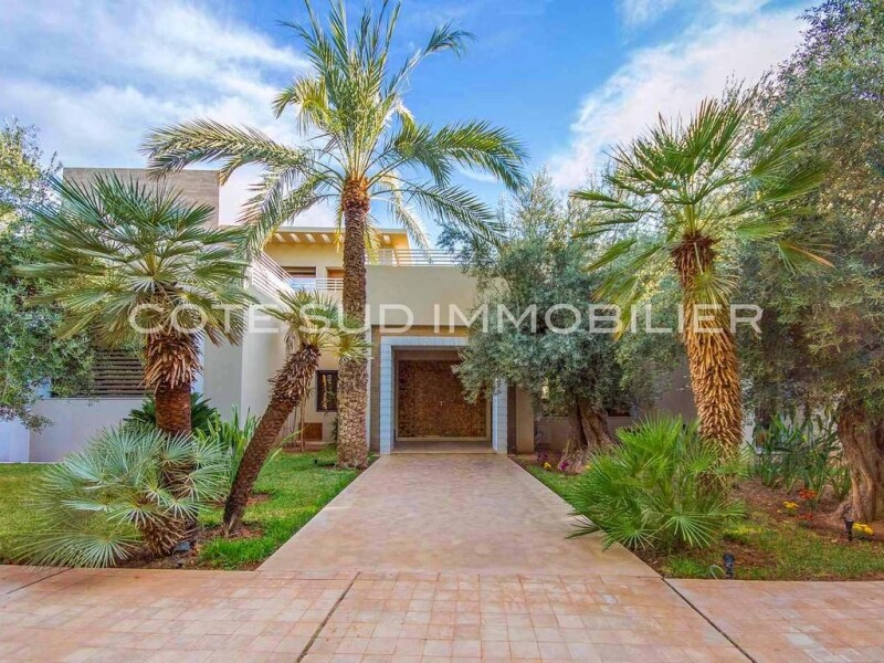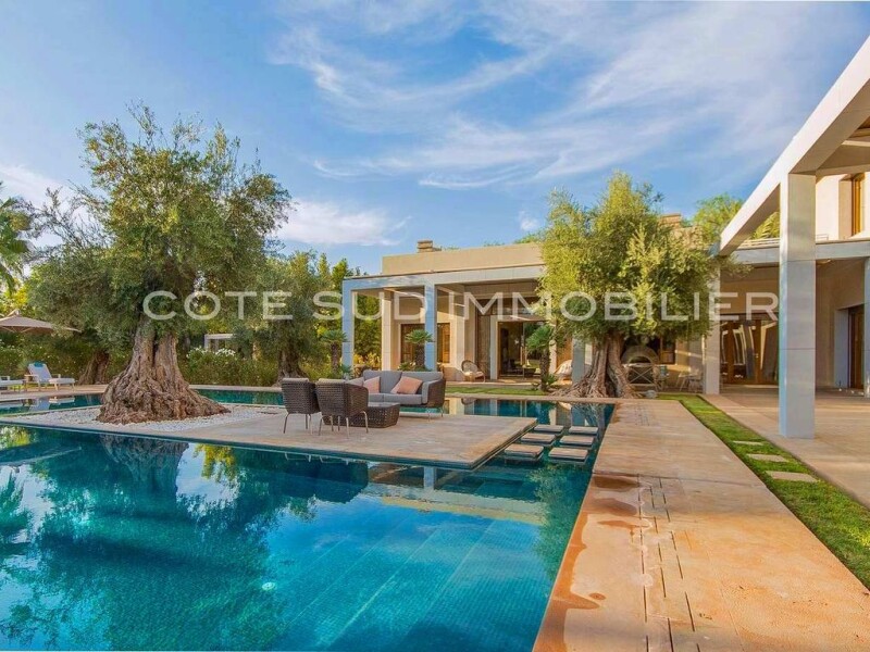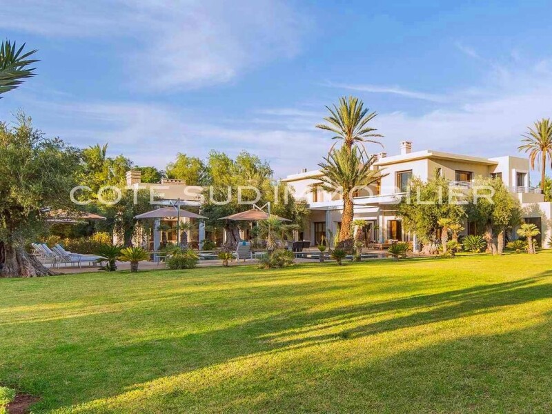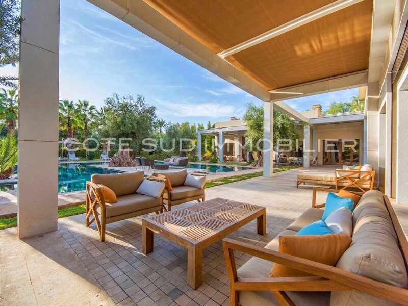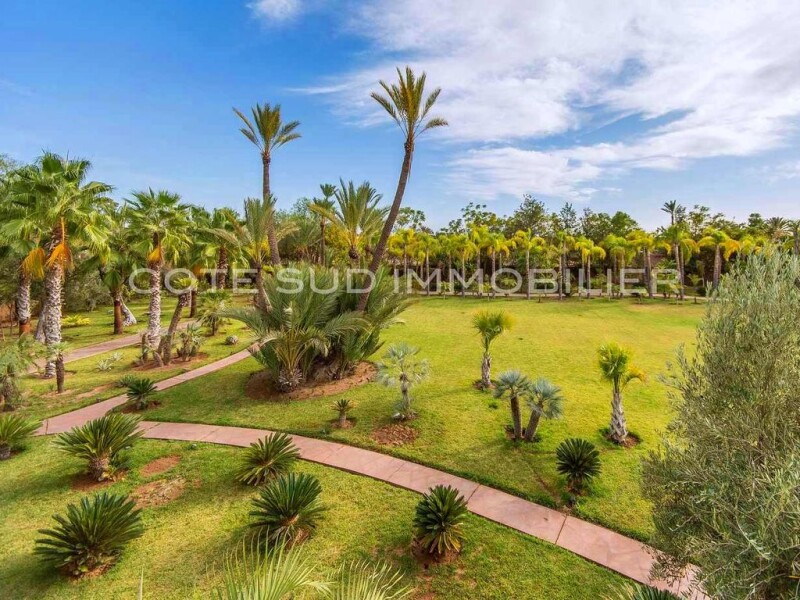 Exceptional villa of 900 m2 on 1 hectare, palm grove, swimming pool, spa, hammam. This villa brings together all the know-how of Moroccan craftsmen, without renouncing modern comfort in terms of heating, home automation and spaces. It lets in the light and its large openings allow its owners to contemplate the park and the radiant sky with the snow-capped Atlas. Privileged place where life is good, 15 minutes from La Mamounia. You can enjoy the spa, hammam, massage room, the swimming pool and the shaded terraces bordering it. A guest house of 200 m2 with suite, bathroom, living room and fitness room in the basement can be delivered with the villa. Underfloor gas heating, reversible sheathed air conditioning with individual control per room. Home automation and remote control for openings, lights, heating and sound system, present in all rooms. Outdoor and garden lighting by led, drip irrigation. 2 ° kitchen in the basement. Accommodation for 4 servants, two in the villa and 2 outside the villa. Product of rare quality. Price upon request.