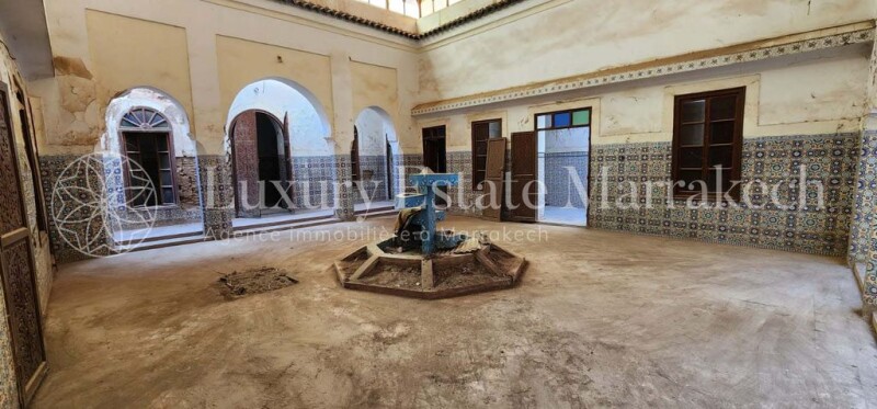 Riad to build, on 1028 m2 on the ground, 2450 m2, 26 rooms and suites, full basement, authorized plans Rare opportunity to acquire in the Zaouia district, in full expansion, a riad to rebuild titled with 998 m2 on the ground and 2450 m2 of living space and basement of 655 m2. Including a zaouia of 30 m2 adjoining the riad. The plans are authorized for 16 rooms with dressing room bathroom from 28 to 33m2 and 10 suites from 46 to 63 m2. 11 mx 3 m swimming pool, hammam, spa, sauna, fitness, bar, cafetaria, restaurant, reception hall, lounges, furnished terraces, elevator. Designed to accommodate a high-end clientele and become one of the jewels of the medina's hotel and restaurant industry. Estimate for the amount of work: €1,800,000 Fees payable by the buyer: 5% excluding tax.