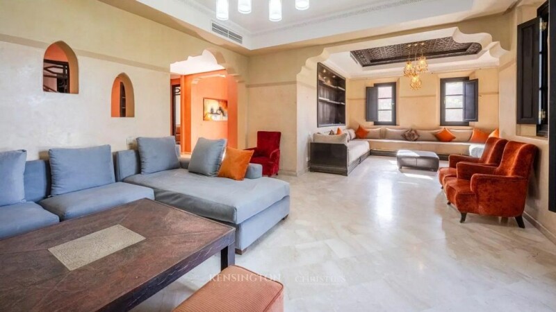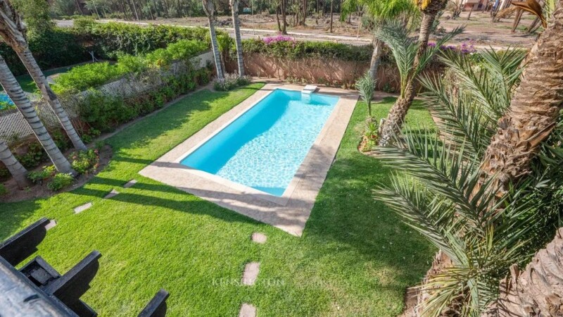Very pretty villa in the Moorish style with a living area of 200 m2, ideally located in a quiet and secure residence in the Palmeraie district, close to the main roads and close to a renowned golf course. You will find on the ground floor a large entrance leading to a living room with its carved wooden ceiling, a dining room with its fireplace and direct access to the terrace, a first suite with its bathroom and large closets, a large kitchen with direct access from the outside and a service area, guest toilets. The first floor is dedicated to the sleeping area with on one side a second suite with dressing room and bathroom and on the other side the master bedroom with a lounge area, a bathroom and a large dressing room. Each of the upstairs bedrooms has its own private terrace. On a plot of 500 m2, facing south, the 7*3.5 m swimming pool is located in the middle of a perfectly maintained landscaped garden.