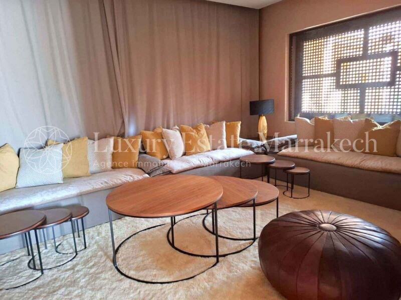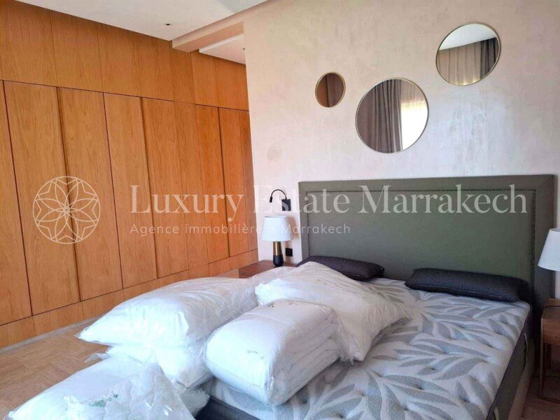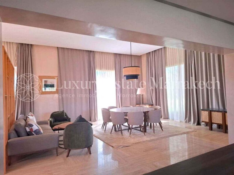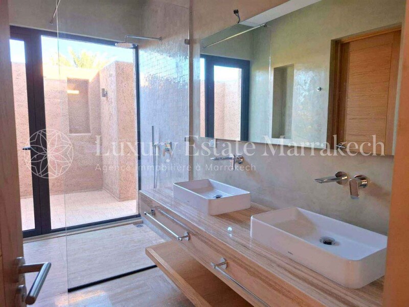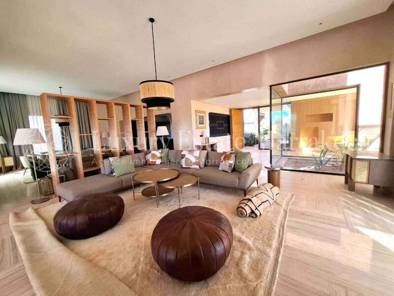 Villa on the 1st line of golf on 7500 m2 of wooded park and a 20 m swimming pool with jacuzzi. Bungalow offering a bar, bedroom and bathroom. The villa is available in 6 double suites, all with dressing room bathroom, 3 patio lounges, equipped kitchen. Quality construction, the villa is sold fully furnished. The secure residence offers many services; concierge, hotel service, organic farm, many restaurants. Ideal location, facing the Atlas just 15 minutes from Marrakech. High rental value (€3000 per day).
