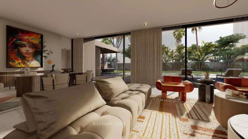 Description of the project of villas for sale off plan located 10 km from Marrakech on the Ourika road. An exclusive estate composed of 6 high-end villas, 24/7 surveillance with 2m high perimeter walls. At the entrance, a caretaker's lodge with automatic gate, technical room, garbage room, guest parking and a mini children's park. The project technically includes a mini TASFIA wastewater treatment plant, a 12m wide internal traffic lane lit by designer LED street lights, a 300m tarmac access. The villas with an area of 530 to 580m² on land of 1300 to 1700m² will be built over a completion time: 12 to 15 months. Payments in installments depending on the progress of the work (Perfect Completion Guarantee, Biennial Guarantee and Ten-Year Guarantee). Seismic constructions compliant with RPS2000 standards. Use of quality concrete from the Béton MENARA plant. Reinforcements and formwork validated by a BET and an inspection office. Peripheral walls in isothermal red bricks with rock wool insulation. Waterproofing of roof terraces and 14x6m overflow swimming pool. Rectified porcelain stoneware tiles 60x120 cm or 100x100 cm on the ground floor. Marble in the bathrooms and large strip parquet floors upstairs. Smooth coated plaster on walls and ceilings with hollow joints and LED strips. White ceilings in three layers. Walls with three coats of paint in various shades (beige, cappuccino, brown, caramel and white). Doors and wardrobes in walnut or beech finish. Vanity units in walnut or beech finish in the bathrooms. Double glazing with thermal and sound insulation. Latest generation aluminum profiles for high energy performance. Suspended steps in walnut or beech finish with glass railing and LED lighting. Distribution by network of multi-layer cross-linked polyethylene tubes. Thermodynamic solar water heater. Ducted reversible inverter heat pump throughout the villa with independent zones (DAIKIN brand). Latest generation photovoltaic panels with or without storage battery. (Option). Protected cabling network with LEGRAND brand equipment. Indoor peripheral alarm with video surveillance. Automatic entry gate with digital code and video. GROHE or ROCA brand wall-hung toilets, taps and mixers. Free-standing sinks and bathtubs (x2 for 5-suite villas). Equipped kitchen with central marble island. Fully furnished laundry room with independent access. Enclosed and landscaped garden with orange trees, lemon trees, palm trees, bougainvillea, cypresses and bamboos. Lawn with automatic watering (synthetic grass optional). Desert corner with gravel, pebbles, desert plants and cacti. Site supervision : Close supervision by a works manager, the architect, a technical design office and a control office. Bimonthly site monitoring report with photos and videos.