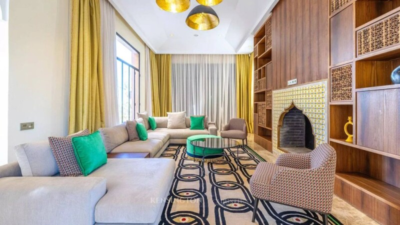 All the art of Moroccan craftsmanship mixed with modern standards make this golf-front villa an exceptional villa. The entrance leads to a majestic reception with high ceilings adorned with a skylight. This reception, opening onto its luxurious garden and swimming pool, includes a living room with refined, wooded touches where you can relax by the fire, a traditional Moroccan living room and a dining room. A European kitchen and a guest toilet. The first floor accommodates 4 beautiful suites with refined decoration as well as their room with shower or bathtub and a very cozy little living room. The view from the roof top is as far as the horizon over the Atlas mountains and the Argan golf course. Its generous basement includes a living room with terrace, a hammam, a professional kitchen and two bedrooms for staff. Technical area.
