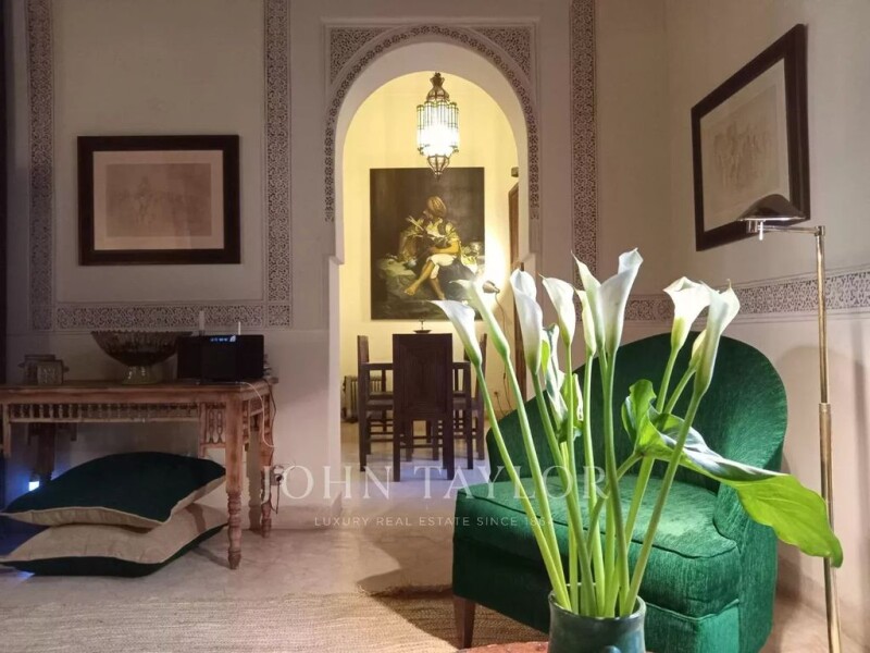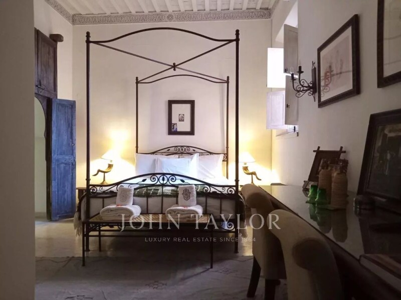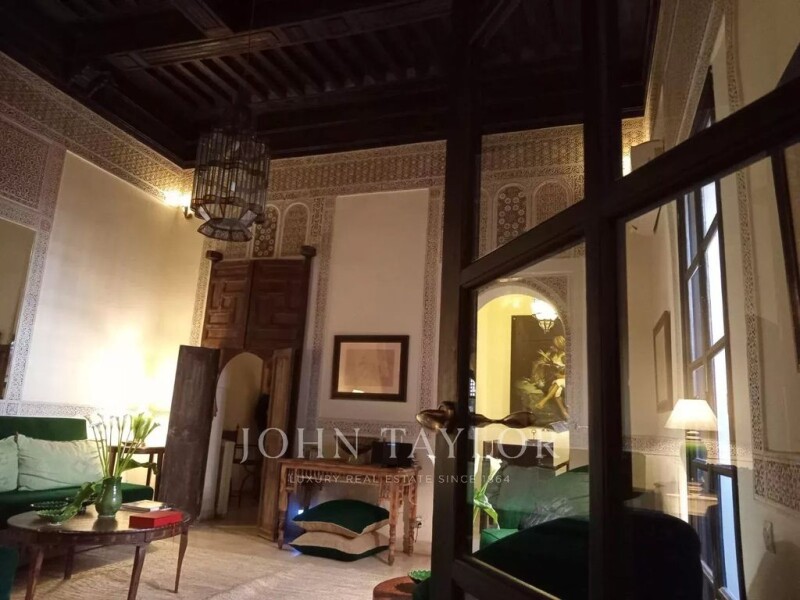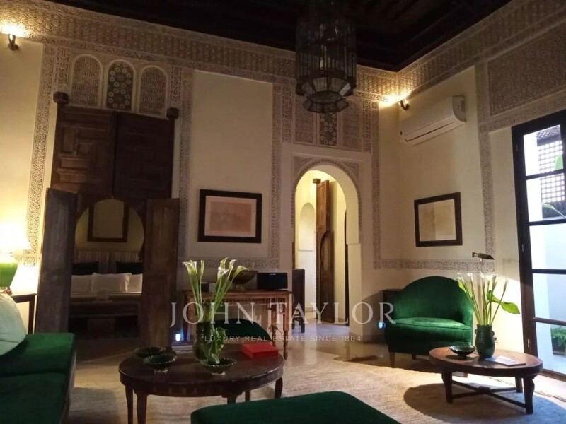 This property is enviably located in the Dar el Bacha district, the most sought after area of the UNESCO listed Medina of Marrakech. It is only a few minutes walking distance from major landmarks. Dating from the 18th century, this elegant house features awesome architectural details that its current owners have tastefully preserved while renovating. Boasting a 110 sqm internal size, it comprises on the ground floor an entrance and a bathroom. The first floor comes with a superb living-room with ancient cedar ceilings and plaster ornaments, a dining-room, a fitted kitchen and 2 bedrooms, one of which ensuite. The upper level hosts a third ensuite bedroom and a lovely roof-terrace with shaded dining and views over the Koutoubia. This unique titled property is being sold mostly furnished.
