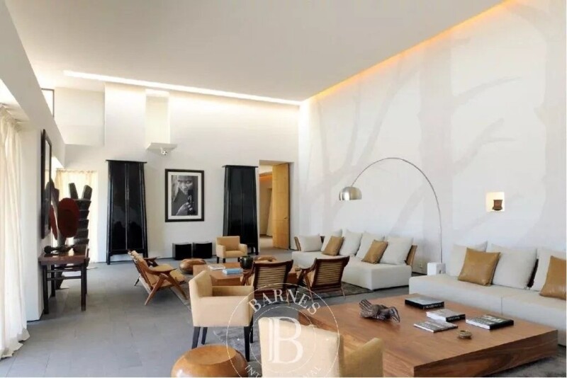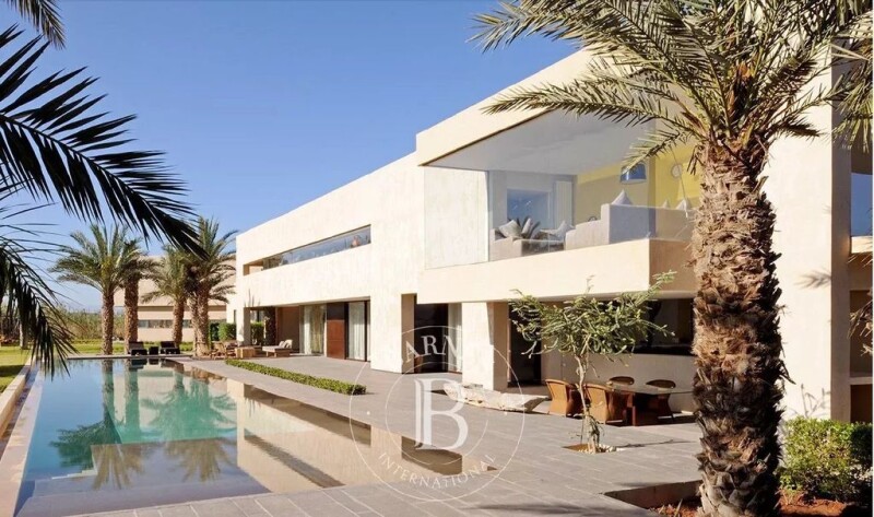 Located in Bab Atlas, the Villa offers a quiet and relaxing setting in the heart of the palm. The land has a breathtaking view of the snowy peaks of the Atlas mountain chain of Jebilates. The city center, the famous place Jamaa El Fna, the main tourist attractions and the lively Marrakech are easily accessible after a journey of twenty minutes by car. design: The Villa is located on a plot of 1 hectare .It has all the characteristics of a luxury villa in a minimalist architectural setting. The construction of the house mixes with subtlety of European-inspired avant-garde elements and noble materials characteristics of the local architectural tradition such as steel and natural stone. The particularly well studied distribution plan is functional to provide a comfortable environment while being practical and easy to live. Program : The villa with a covered area of ??1200m2 consists of 2 buildings connected by a corridor. Building 1 includes: An entrance with direct view of the pool A set reception lounge, dining room with fireplace A cinema room independent TV, A kitchen with a courtyard and equipped office, Guests of health, A master suite: bedroom, living room, dressing room, bathroom, shower, separate toilet Building 2 consists of: Five rooms with private terrace, dressing bathtub, shower, separate toilet. The external include: A large terrace adjoining the lounge A pool with a length of 23m An outdoor lounge open on two sides drowned in a large square of white roses An outdoor dining area Side town, at the entrance, the caretaker's house with living room, bedroom, kitchen and bathroom.