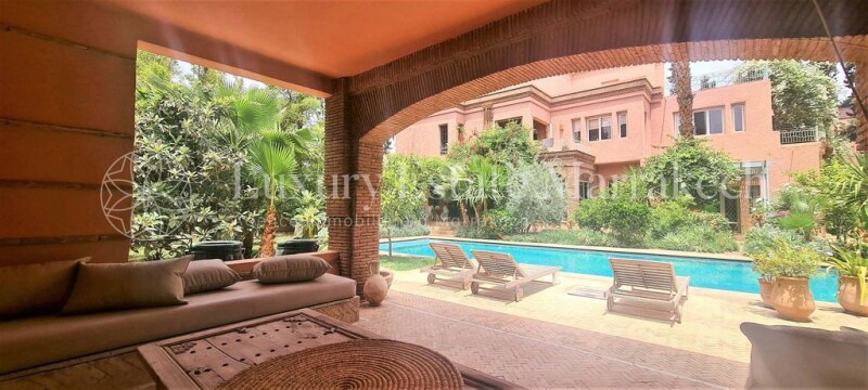 Marrakech, pretty villa of 640m2 on a park of 1300 m2, swimming pool 15 m, 2 suites, 2 bedrooms, terrace, basement. Very pleasant villa, located in the Targa district, 5 minutes from the French high school. It offers on its wooded park a swimming pool of 15m x 5m, a kiosk. The villa is composed on the ground floor of a large living room with 2 fireplaces, a large living room and a tea room, 2 large terraces and a large equipped kitchen. Large basement with English courtyard. On the first floor, a master suite with bathroom and dressing room and a south-facing terrace overlooking the swimming pool. 2 other bedrooms with a bathroom On the second floor, a master suite, bathroom, dressing room and large terrace. Very well distributed villa with good southern exposure. May be suitable for housing, or commercial use, private clinic….