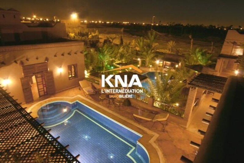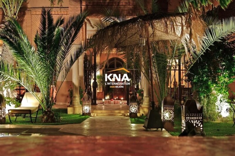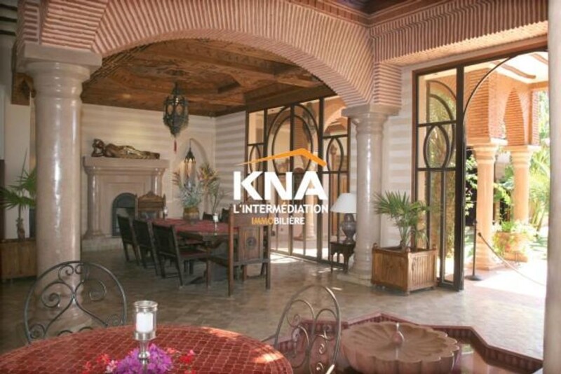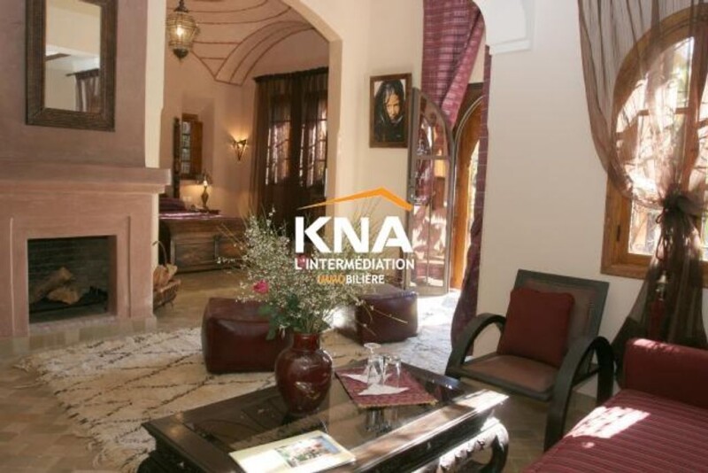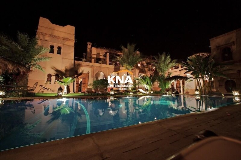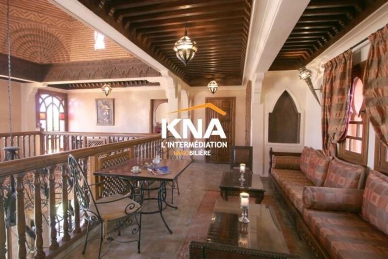 Guest palace with traditional Moroccan architecture and refined lines located at the entrance to Marrakech away from the hustle and bustle of the city, 5 minutes by car from the city center. Living area: 1200 m2 Land area: 2264 m2 It consists of: On the ground floor: 1 Living room 1 Large living room with central fountain and two fireplaces Fitted kitchen + rear Kitchen (professionally equipped) Office Dining room 2 Suites each with a bathroom bath, reversible air conditioning, satellite TV, minibar, safe, fireplace and wifi 1 Bedroom with bathroom, reversible air conditioning, satellite TV, minibar, safe, fireplace and wifi 1st Floor: 5 Suites of 30 to 40 m2 with each a bathroom, reversible air conditioning, satellite TV, minibar, safe, fireplace and wifi 1 Suspended swimming pool of 8m x 3m with pergola 3 Private terraces for the suites 1 Mezzanine with a dining room Corridor in front of each room overlooking the garden Furnished terrace with pergola 2 independent pavilions with private gardens Mezzanine floor: 3 Massage cabins 1 Hammam 1 Guest toilet 1 Large relaxation lounge 1 English courtyard with fountain and palm trees 1 Linen room 1 Technical room 1 Staff room with shower and toilet Miscellaneous: 2 Swimming pools including one of 16m x 7m Solarium Deckchairs and parasols Discreet panoramic terrace Parking for 4 cars Garden with palm trees, lemon trees, orange trees, geraniums, jasmines, bougainvillea and rose bushes... Caretaker's house, personal changing room with shower and toilet Pergola in front of the swimming pool Shower and wc for guests Private parking for 4 cars Technical room Aviaries for birds Sale price: 1,680,000 euros Other villas for sale in Marrakech: Purchase villa Marrakech.