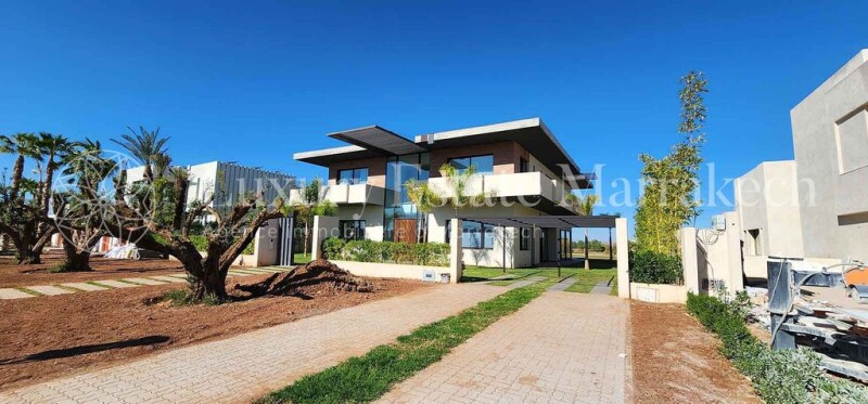 New villa 800 m2, 1st line of golf, 5 bedrooms, swimming pool 16 m, view atlas, 1200 m2 land. Prestigious villa on the Golf of Amelkis, beautiful volumes and neat finish. Ground floor: – 1 large living room with through fireplace – 1 dining room – 1 Moroccan living room – 1 bedroom with bathroom – 1 kitchen Equipment: – 30 solar panels (1400 KVA) – 16m x 6m swimming pool with jacuzzi – 1 well – two parking spaces – centralized air conditioning for the common areas – 1 guest toilet – 1 kitchenette 1st Floor: – 1 master suite with bathroom and dressing room – 3 bedrooms with bathrooms and dressing room. Dream location on the golf course and the lake on the swimming pool side and facing south with a view of the Atlas on the other side.