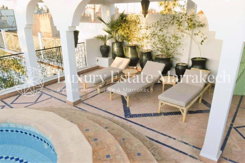 Riad 20 bedrooms, 23 years of activity, the best commercial location in the medina, swimming pool, solarium. 1200 m2 built and 550 m2 on the ground. Located in one of the best areas of the Medina of Marrakech, just 3 minutes from Jma El Fna Square and only 10 minutes from Marrakech Menara Airport, this 20-room riad is accessible by car. Once you have crossed the porch and left the hubbub of the alleys, calm and the song of birds await you in the flowered patio in the middle of the riad. Sunlight streams in from the top of this open patio, surrounded by lounges where you can relax. The rooms are accessible by a maze of corridors and intimate staircases, quiet, with their bathrooms and toilets, most of them opening onto a balcony overlooking the flowered patio. In a Moroccan style, the main riad and its douiria together have twenty bedrooms and twenty bathrooms. On the terraces, a pretty swimming pool allows you to cool off and deckchairs to enjoy the omnipresent sun. The materials are traditional: bejmates, zelliges, dess, taddelack and carved cedar. This riad, created more than twenty years ago, constitutes a tourist reference in the medina and is part of the hotel heritage. Certainly one of the best businesses in the medina, the area is excellent and certainly the best commercial location. The staff in place ensures smooth operation, and future buyers only have to ensure the sustainability of this very good business. 100% occupancy rate, very good turnover. Possibility of acquiring in the same spirit, a Ksar of 10 suites, 1200 m2 built in a residential area of Marrakech with a park of 2200 m2, 2 swimming pools and a large spa of 200 m2, hammam, 3 massage rooms.