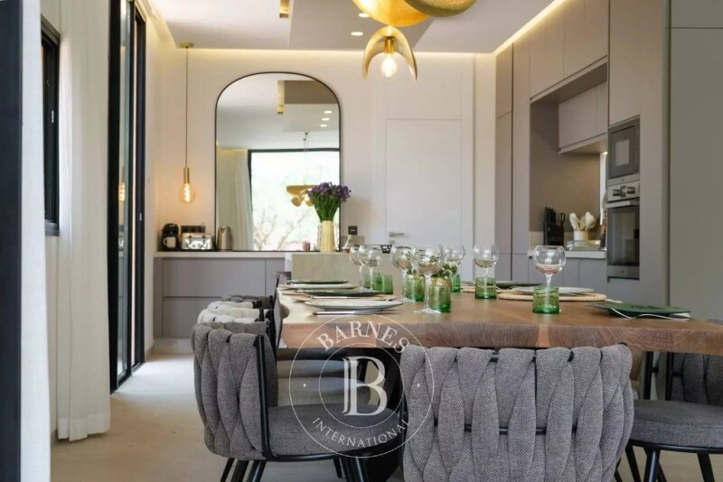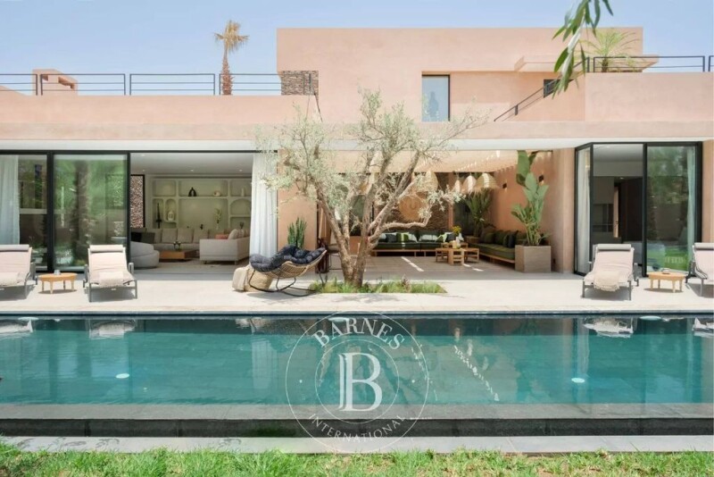 Contemporary villa under construction (structural work finished finishing work in progress delivery in 3 months) for sale on a fully landscaped plot of 1335m (real photos of a villa delivered and inhabited in Altas Nakhil). Architectural villa of 405M2 with 4 suites. living room with fireplace. dining room. fully equipped double kitchen. laundry room. A beautiful 15m infinity pool. automatic gate. intercom. ducted hot and cold inverter air conditioning for each room. Latest generation 300L solar hot water tank. Fully aluminum double-glazed windows. Garden with trees Insulation of the roof and walls with double partitions and rock wool. taza stone and natural oak wood. Jacob Delafond sanitary facilities.